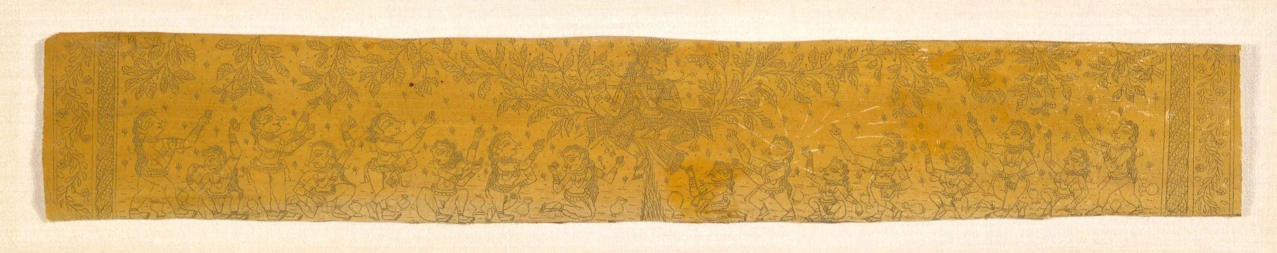 Krishna is represented as the central figure of the symmetrical composition drawn on this palm leaf folio. He sits majestically in a tree playing his flute. Beneath the tree a group of gopis are depicted with long wet hair after bathing. Krishna had stolen the gopis’ clothes so they would be forced to show themselves and, thus, metaphorically reveal their souls to him. The gopis are making salutatory gestures towards Krishna in his honor. See also M.71.1.32 and M.86.250.1.