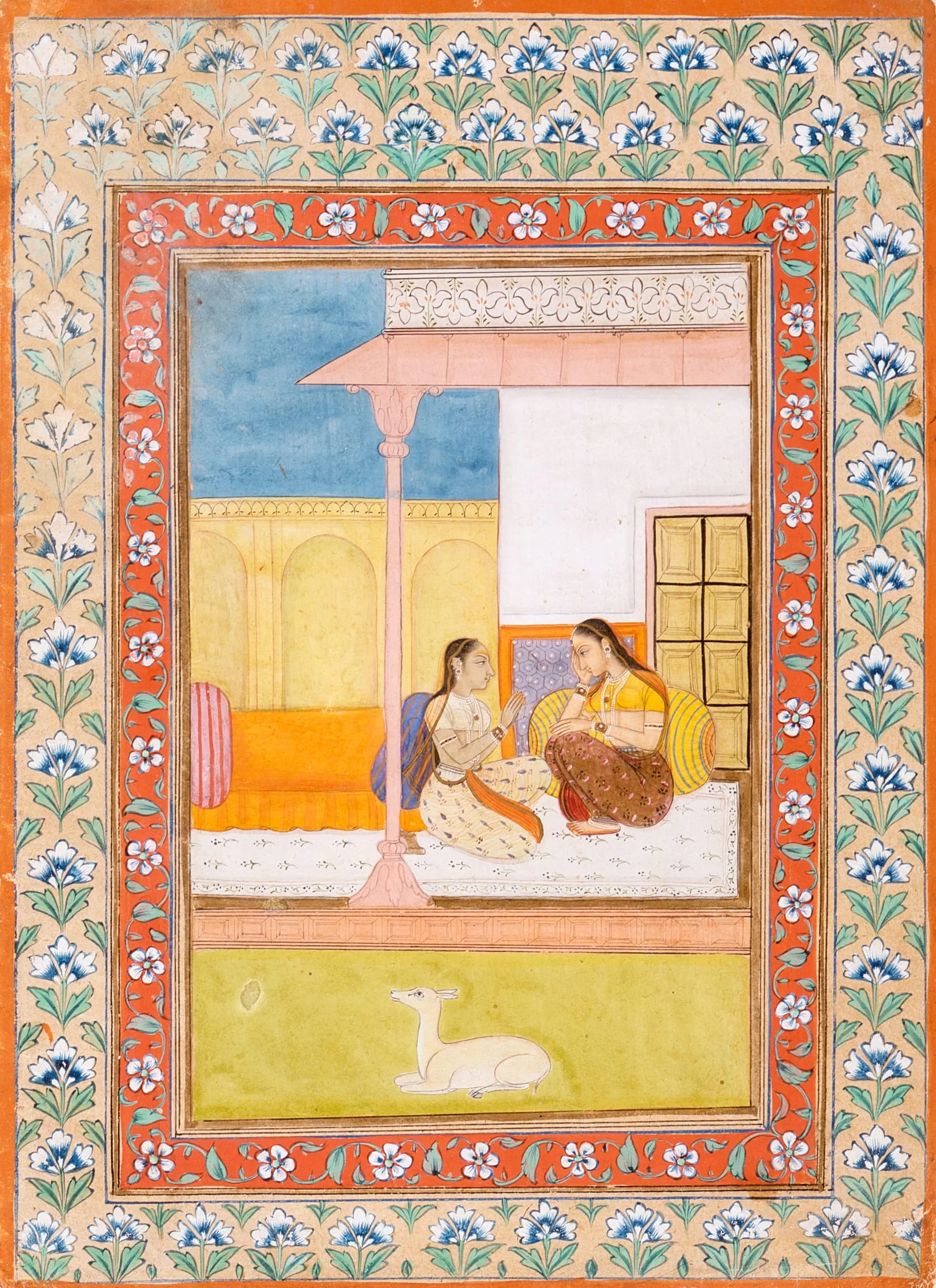 Patamanjari Ragini is an early morning melody associated with Autumn (September–November). This painting accords with the melody’s imagery as envisioned in the Rajasthani tradition with Patamanjari Ragini depicted as a woman distraught by the absence of her lover and sitting dejectedly with her head supported by her hand. She is being consoled by a confidante, who is occasionally shown singing. They are seated on a porch in a palace compound with a forlorn deer resting in the foreground. Stylistically, the painting is descended from Mughal artistic traditions in terms of its figural style and complex painted floral borders. See also M.77.154.8 and M.86.345.7.