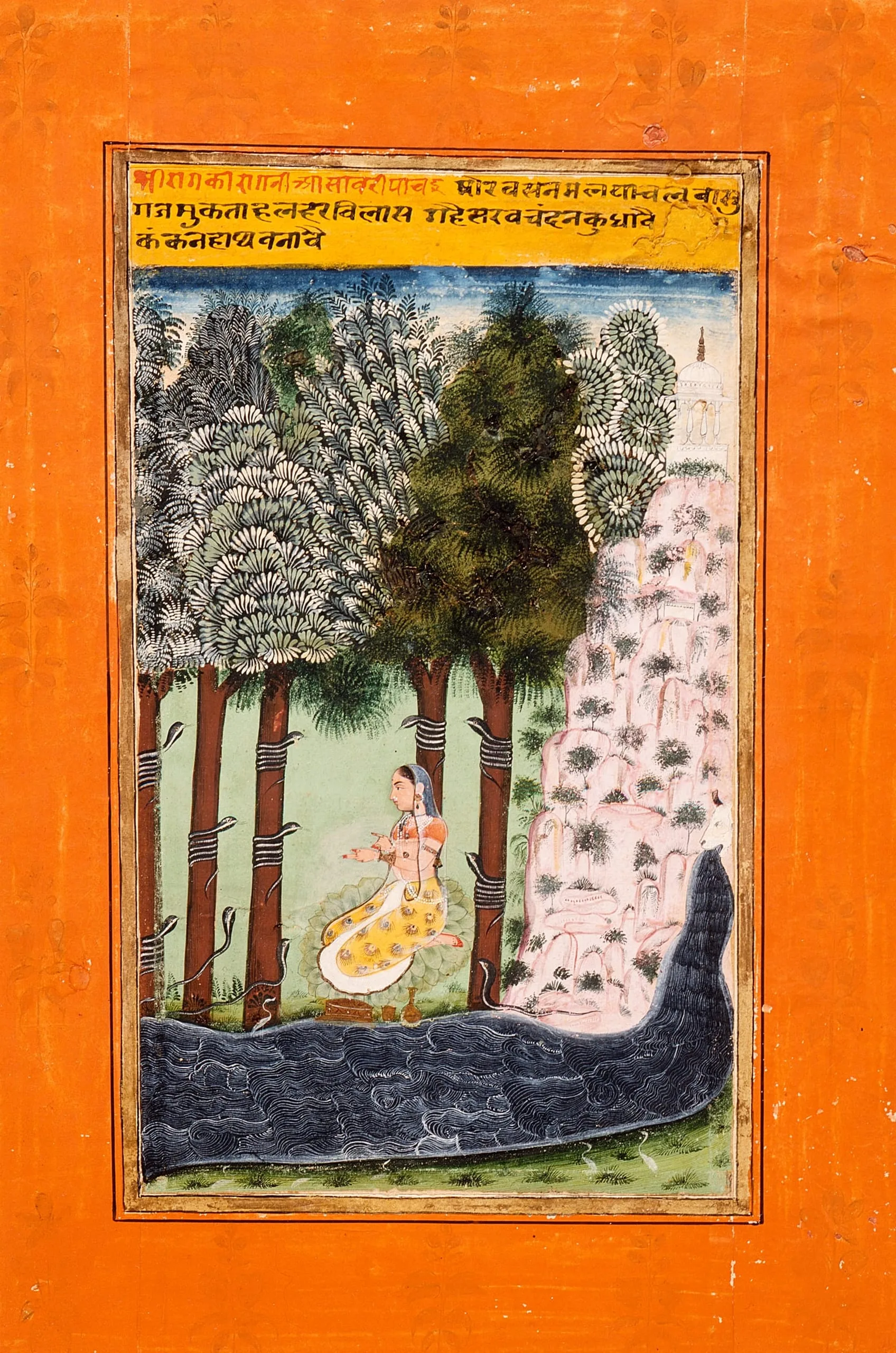 Here, Asavari Ragini is envisioned dressed in courtly attire in a forest glen besides a stream curiously issuing from a bull’s head and flowing down a mountain with a shrine on its summit. She is surrounded by serpents that have wrapped themselves around the trees and are being attentive to her teachings and hand gestures. Her lessons have captured the attention of the waterfowl on the riverbank as well. Poetic verses describing Asavari Ragini are inscribed in the header. See also M.85.139.3, AC1999.127.29, and AC1999.127.30.