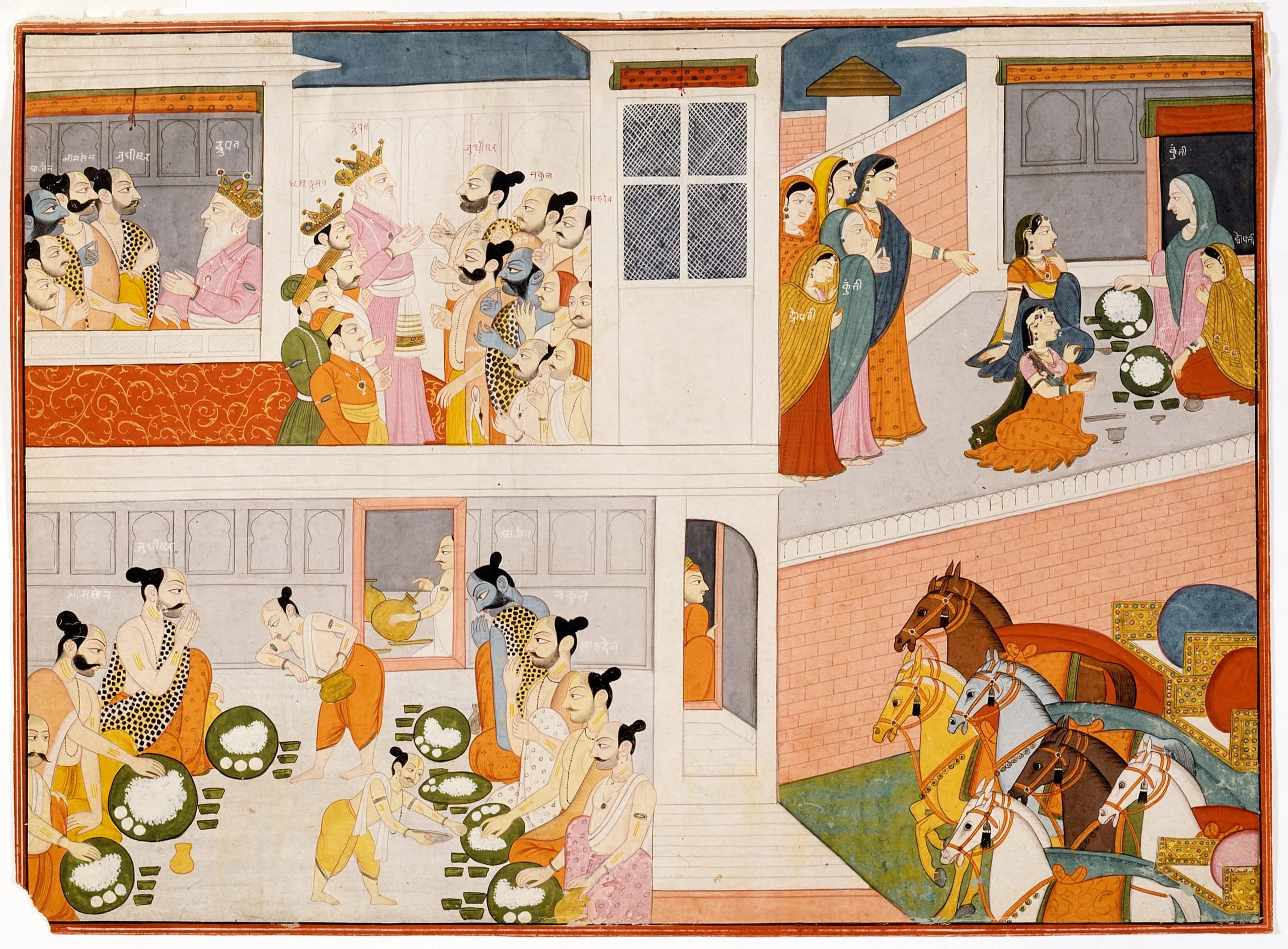 The painting is divided into four sections. In the upper left corner, the five Pandava brothers—Yudhishthira, Bhima, Arjuna, Nakula, and Sahadeva—are shown talking to King Drupad and then outside on the terrace among a larger group of men. Directly below, the brothers are shown eating. In the upper right corner, their mother, Kunti, and their common wife, Draupadi, are shown being led to where they will eat, then sitting down to the meal. Outside the palace walls, in the bottom right corner, several horse-drawn chariots wait, presumably to take the brothers back to their kingdom.