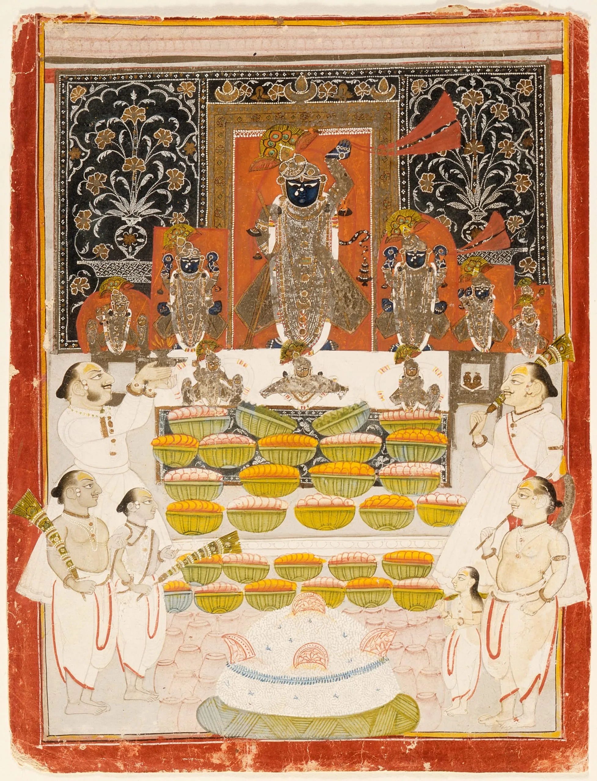 In this tribute painting associated with the Vallabhacharya Sampradaya sect (founded in the late 15th century), the chief priest Damodar II (officiated 1807-26) is shown on the proper right side of the altar performing the ceremony of the Offering of Food Festival (Annakut) to the Seven Images (Sapta Svarupotsava) in 1822 at Nathdwara. The central image represents Shrinathji, a form of Krishna who is shown with his left hand upraised to symbolize his holding Mt. Govardhan aloft to protect the people of Vrindavan from a torrential thunderstorm unleashed by Indra, the king of the gods. As identified by tradition, to Shrinathji’s right are images of Shrimathuranathji and Shrimadanmohanji and his two female companions. To his left are Shridwarkanathji, Shrigokulchandranathji, and an unidentified image. In front of Shrinathji are smaller images of Shrigokulnathji, Shrinavanitapriyaji, and Shrivitthalnathji. Busts of Balakrishnaji and Mukundarayji are in the small niche on the proper left side of the altar. Behind the images is a pearl-embroidered pichhwai (painted textile). Beneath the images are the twenty-nine baskets and twenty-seven jars filled with the fifty-six types of food offered to Shrinathji. The large mound of rice represents Mt. Govardhan. Damodar II ceremonially waves an oil lamp, while his assistant priests hold peacock feather flywhisks and one holds a fan.