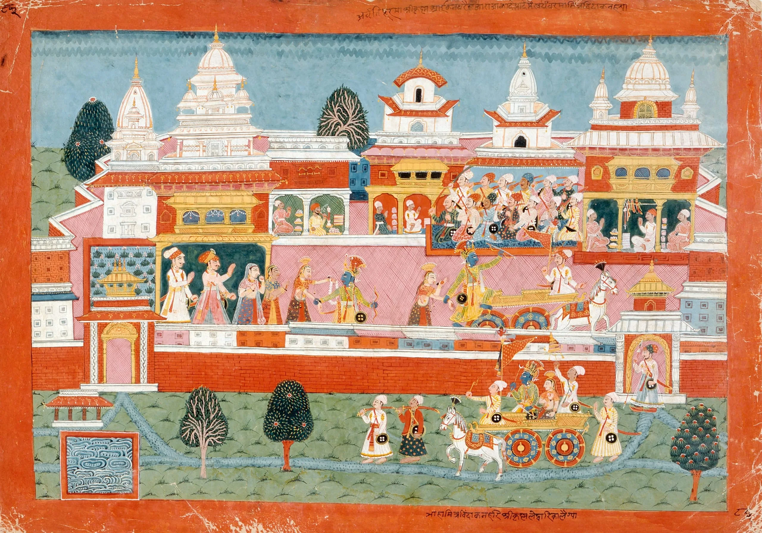 The Newari inscription in the upper border states that Krishna has arrived at Avantipur for a svayamvara ceremony in which a bride to be publicly chooses her groom from an assembly of suitors. Princess Mitravinda, the daughter of King Jayasena of Avanti, desired to wed Krishna against her regent brothers’ wishes and asked Krishna to intervene and rescue her during the ceremony. The inscription in the lower border relates that Krishna abducts Mitravinda (Bhagavata Purana 10:58:30-31). In the center, Krishna grasps Mitravinda by her hand and then leads her into their chariot. In the foreground, the happy couple is depicted leaving for Dvaraka, Krishna’s capital in Gujarat, where they were married and had ten sons.