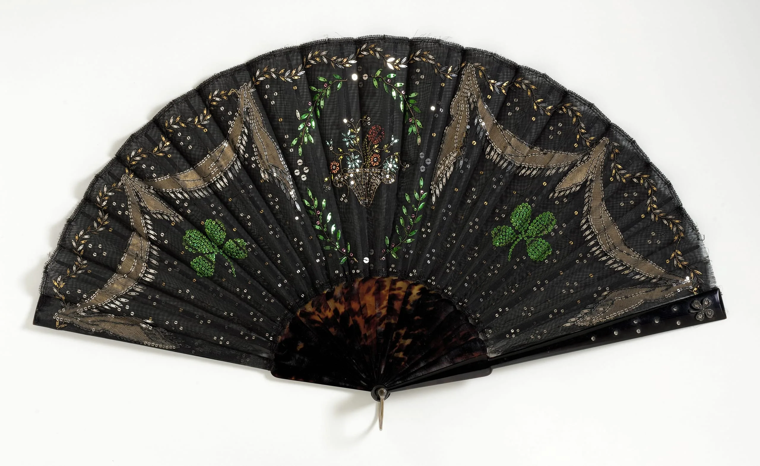 - Silk organdy leaf, tortoise shell sticks, silver metallic over brass loop, brass metallic rivet