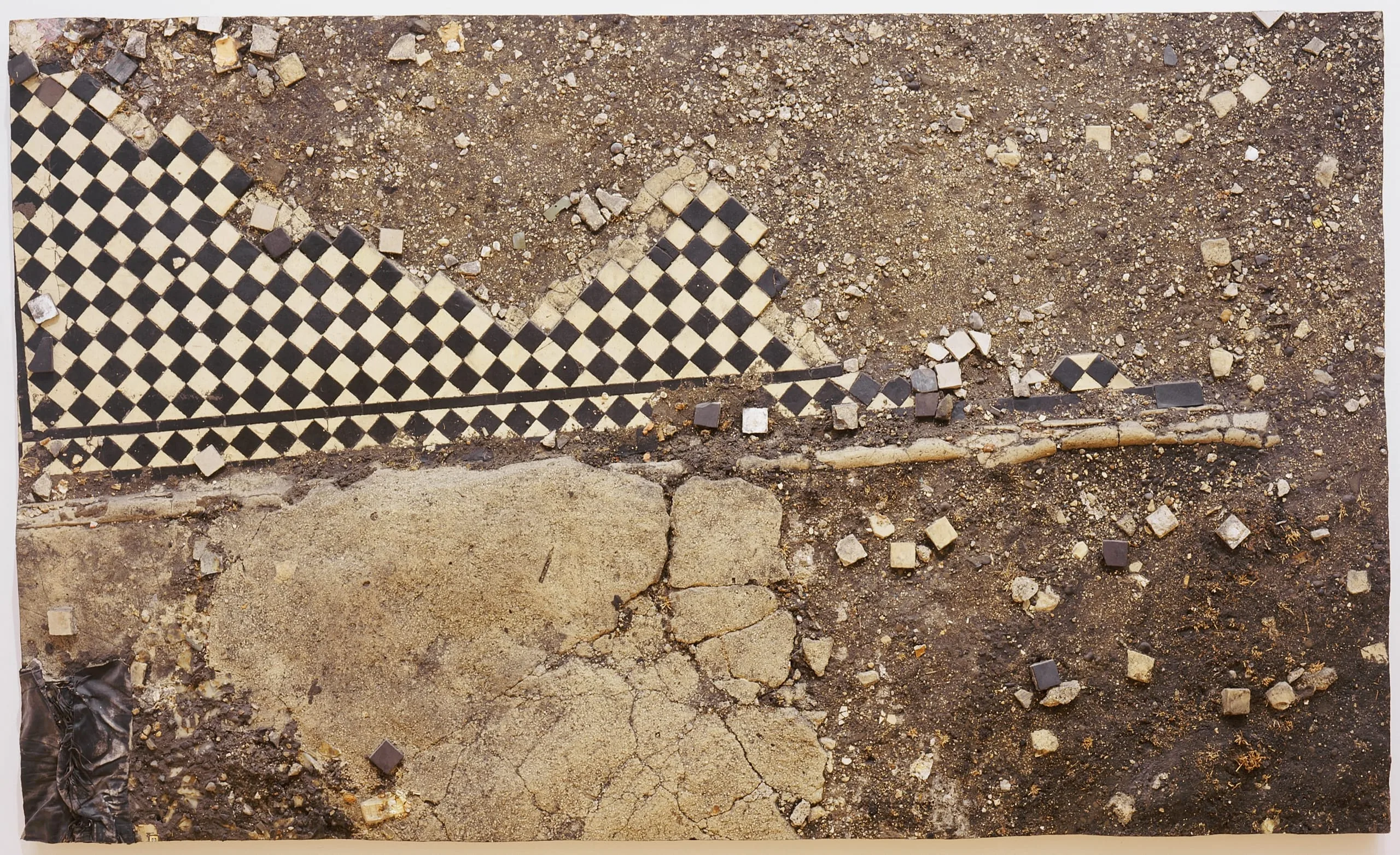 - Study of a Black and White Tile Garden Path with Discarded Leather Jacket