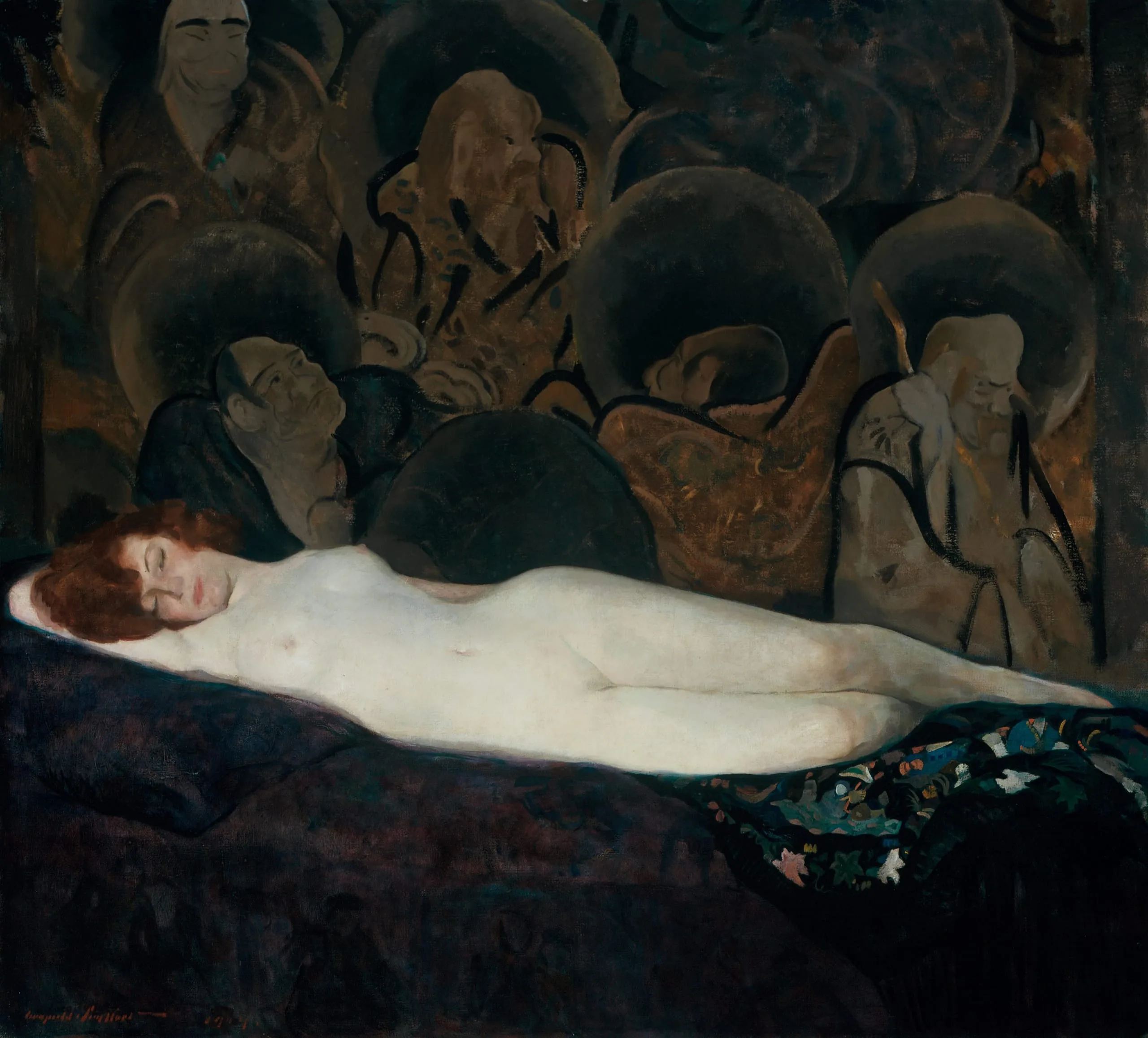 From 1916 to 1922 Seyffert produced a number of major canvases devoted to the nude, and these were so well received when they were exhibited throughout the country that they were usually immediately acquired for major museums. The most modernist works Seyffert was ever to produce, these canvases were no doubt influenced by the nude studies painted by his friend Arthur B. Caries. Both men used the same model, beautiful red-haired Grace Vernon, better known as "Bobby," who would later become Seyffert’s second wife. In several paintings Seyffert placed Bobby in highly decorative interiors with an ornate oriental screen, panel, or drape as a backdrop. Her body was treated as a single form and her extremities generalized or attenuated. In The Lacquer Screen, 1918 (Pennsylvania Academy of the Fine Arts, Philadelphia), the curves of the nude echo the calligraphic lines in the Chinese coromandel screen behind her, but in Nude with Chinese Background the figure is more abstracted, her linear body contrasting with the curving lines depicting the lohans (enlightened disciples of the Buddha) on the background panel. By stylizing the figure and using a creamy ivory, Seyffert accentuated the woman’s sensuous flesh. She appears almost luminous, the shadows on her skin colored by softer tints of the deep burgundy and green in the drapery and the earth-colored panel that surround her.