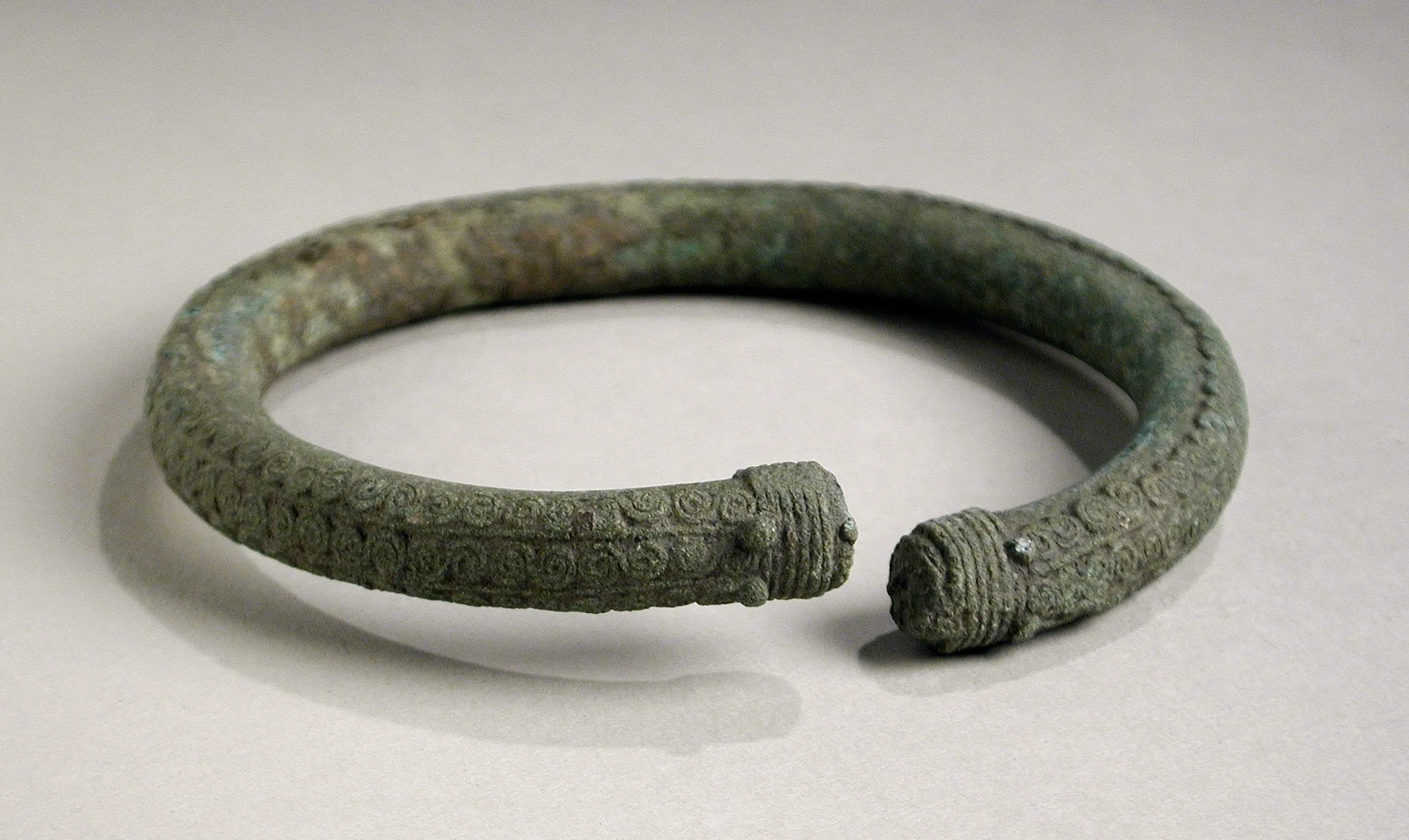 Bronze open-ended bracelet with olive-gray and blue-green patina, covered in raised spiral motifs, with two rounded terminals separated by a small gap
