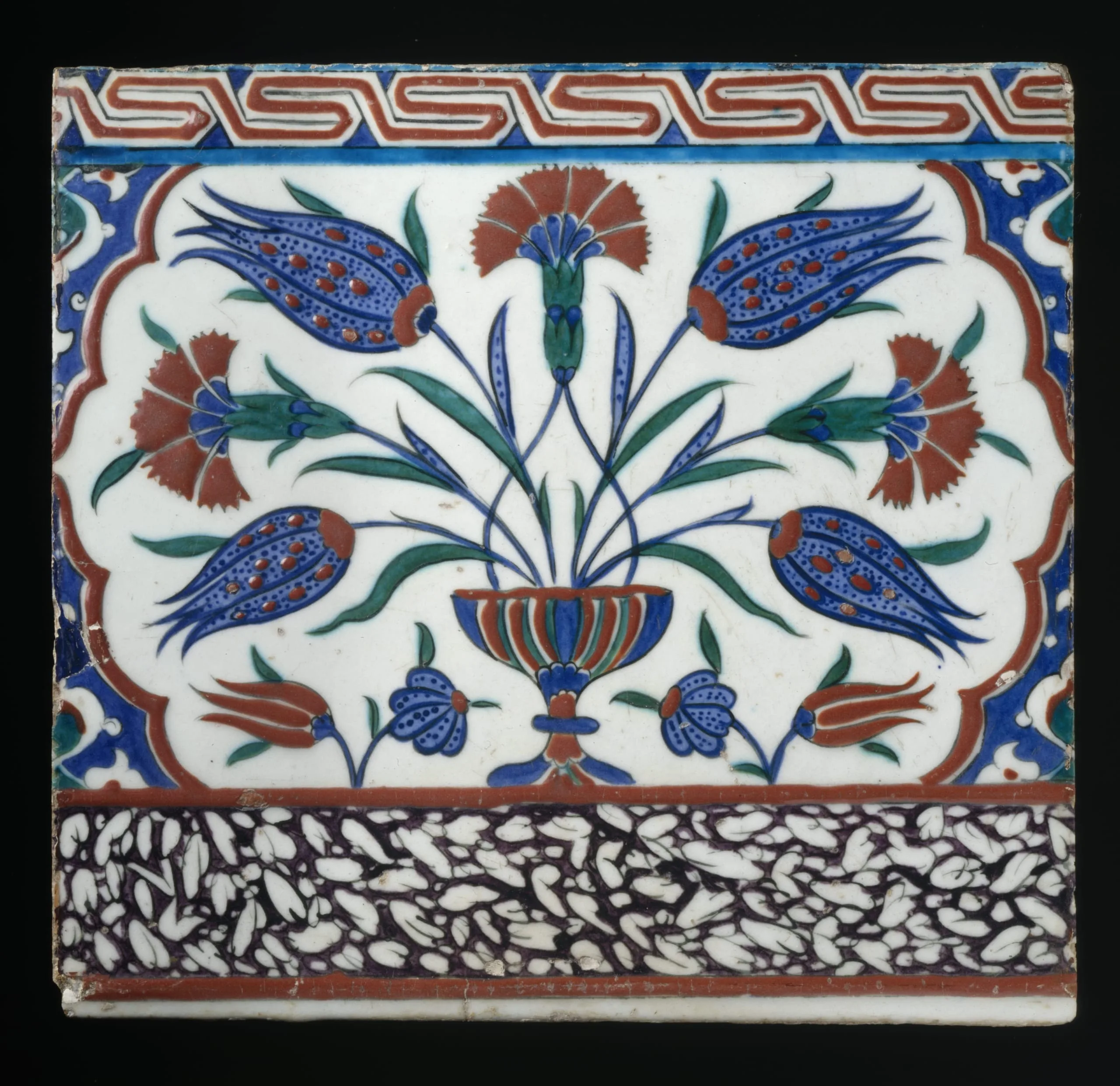 Objects of this type, both tile revetment and vessels, demonstrate the great variety of ornament used by Iznik potters, including the ubiquitous tulip; lush, plump peonies and carnations; and spiky and scrolling leaves as well as bold epigraphic ornament. They also help to illustrate the different stylistic phases of Iznik wares, which in turn reflect the evolution of Ottoman taste in the sixteenth and seventeenth centuries in a variety of mediums.