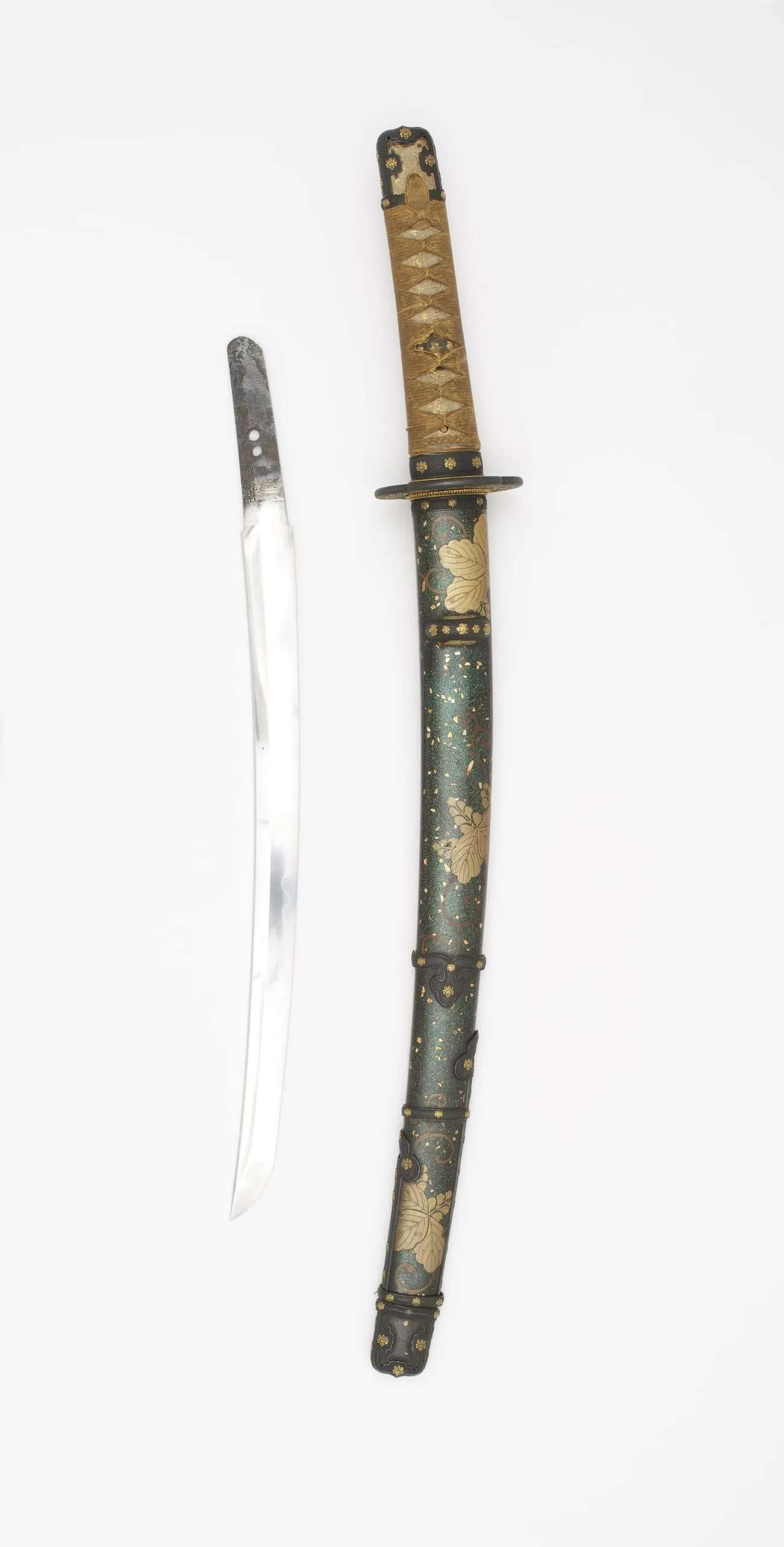 - Steel, copper, gold foil, lacquer on wood, shakudo, silk