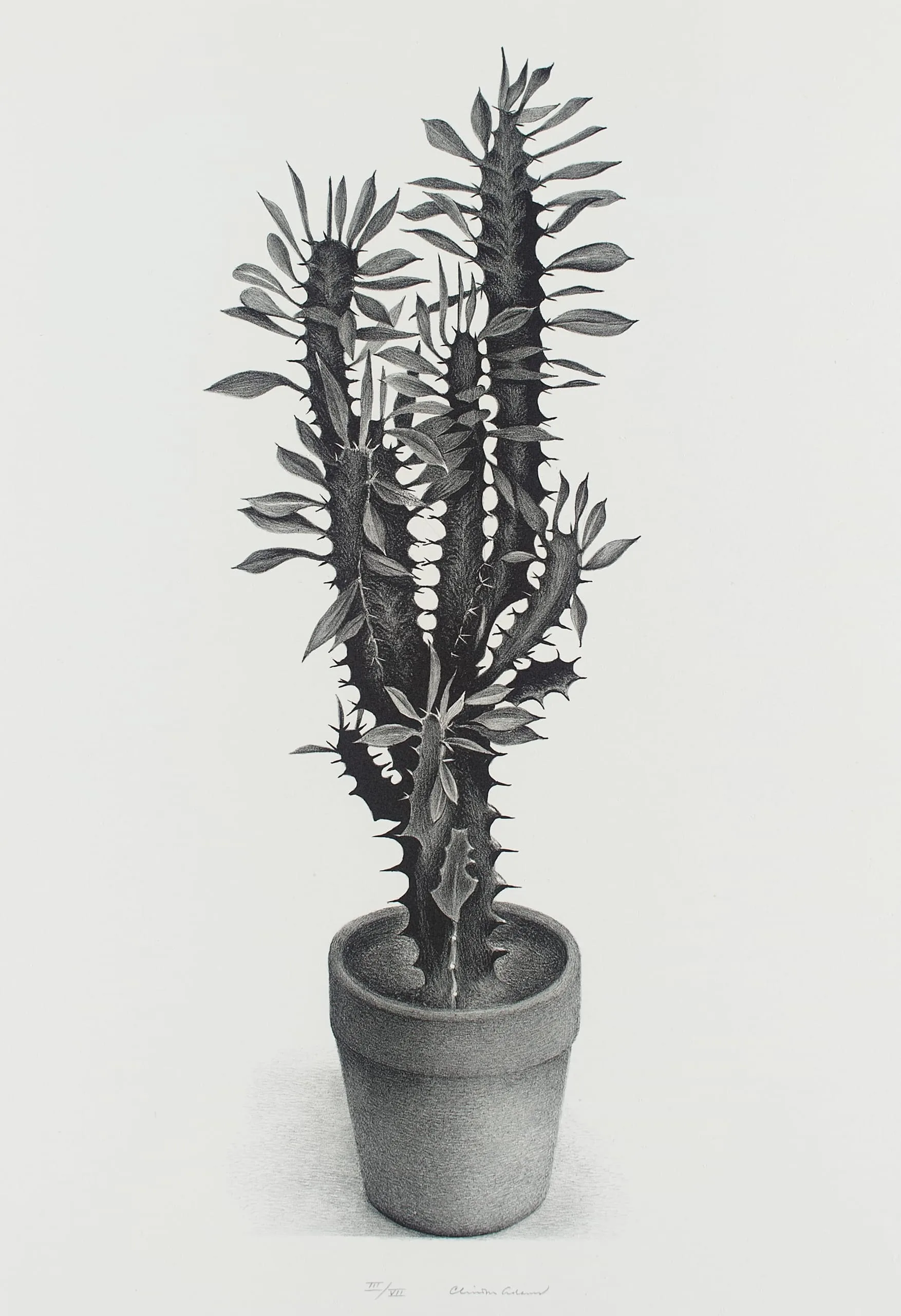Finely detailed print of a tall, spiny succulent in a terra-cotta pot, with strands of white beads draped across the stems, rendered in dense gray tonal gradations on cream paper