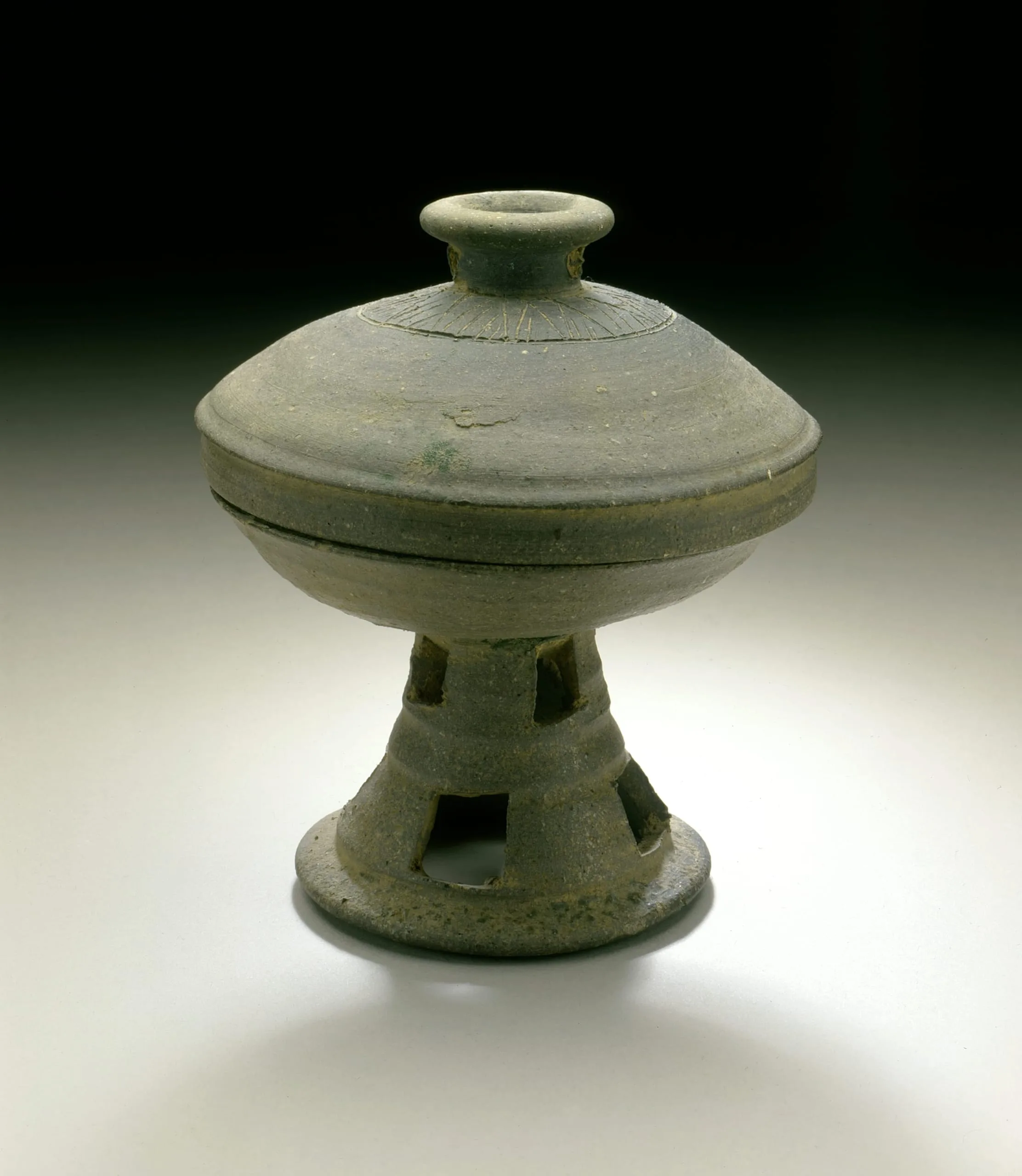 - Coil-built and wheel-turned stoneware with incised and cut decoration and ash glaze