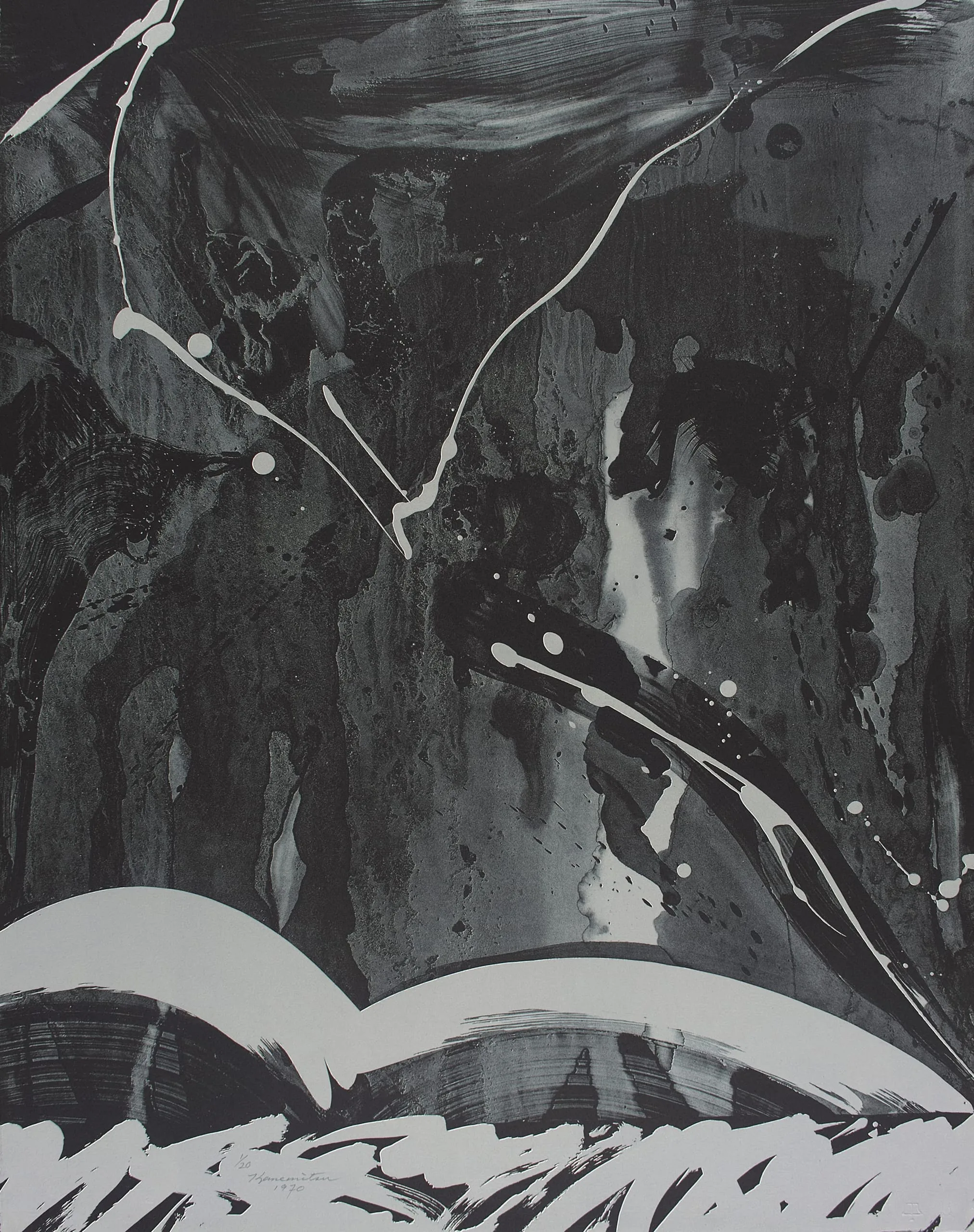 Vertical abstract work in black, gray, and white with sweeping brushstrokes, looping white lines, drips, and bold white arcs along the lower edge