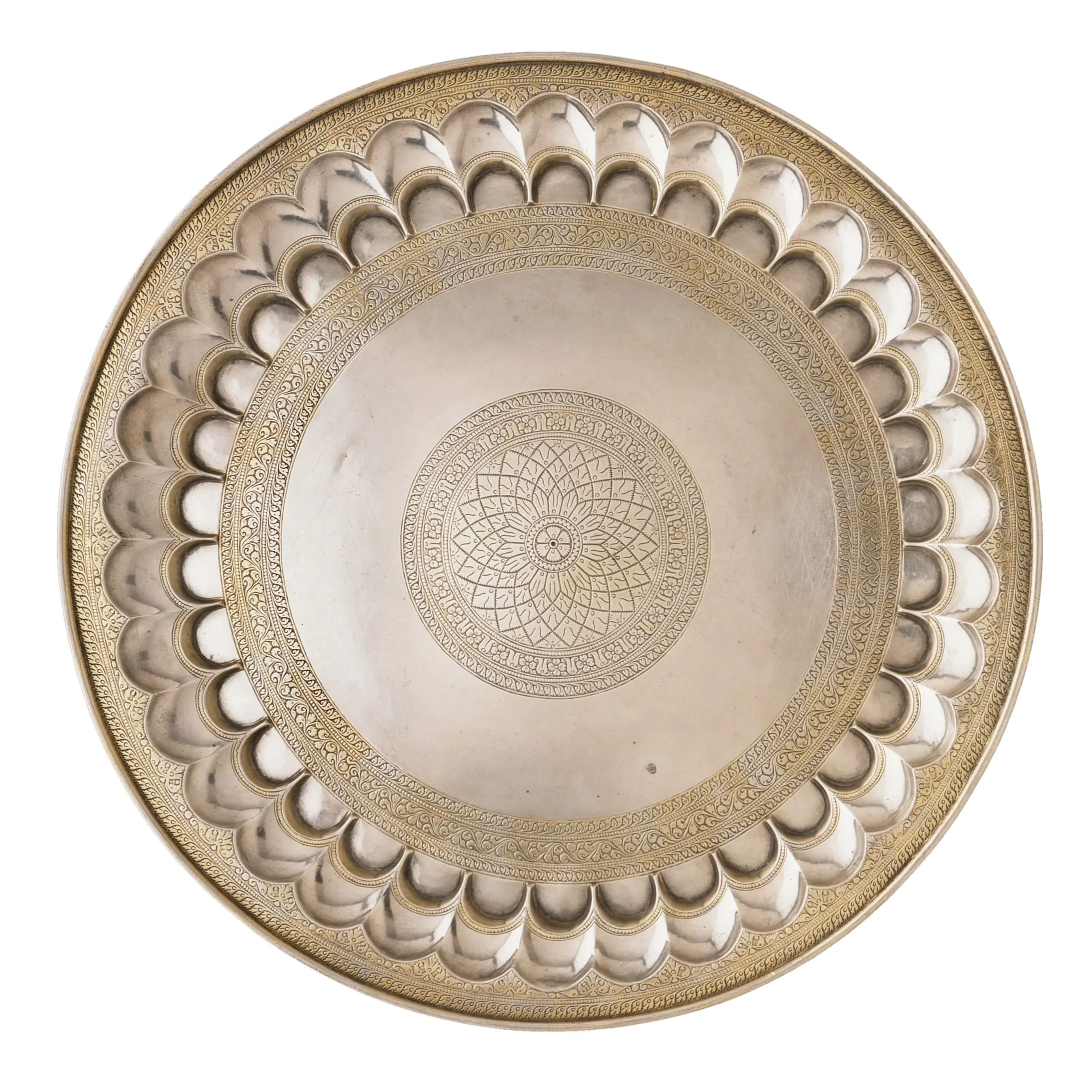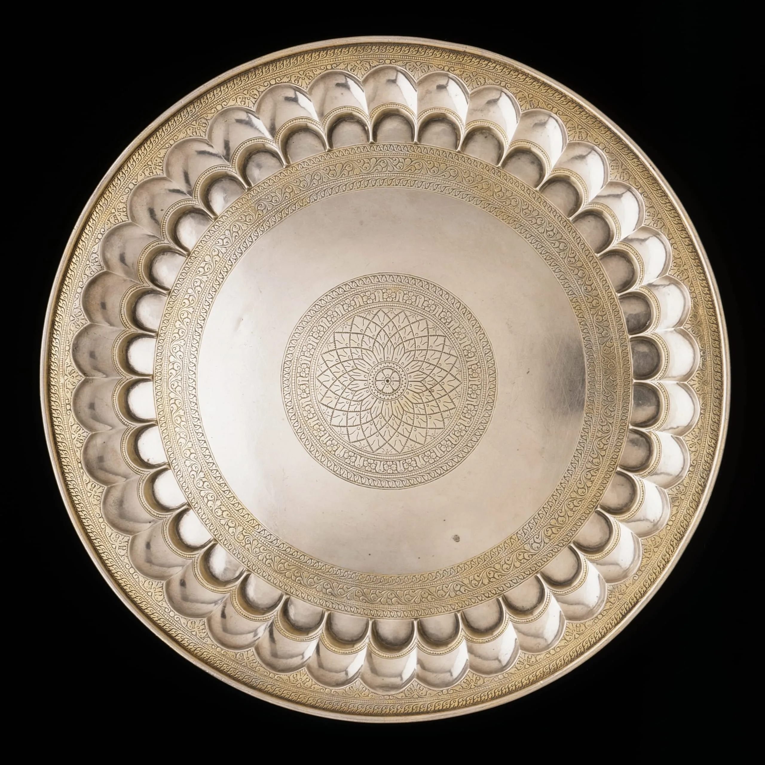 The tray’s elegant incised decoration consists principally of bands of lush floriated scrolls. Its epicenter is an open poppy flower surrounded by a stylized lotus medallion. Radiating outward from the central medallion are concentric areas of partially gilded ornamentation comprised of a broad plain expanse that serves to accentuate the intricate engraved designs; a band of floral and vegetal scrolls; a double row of semi-circular fluting reminiscent of architectural niches, the outer row of which is angled upward to form the side of the vessel; and another band of botanical scrolls. Its interior fluting is a quintessential design feature of Indian metalware, with the double rows of fluting particularly characteristic of silver metalware made in Pune (formerly Poona), near Mumbai, and in adjacent central India.