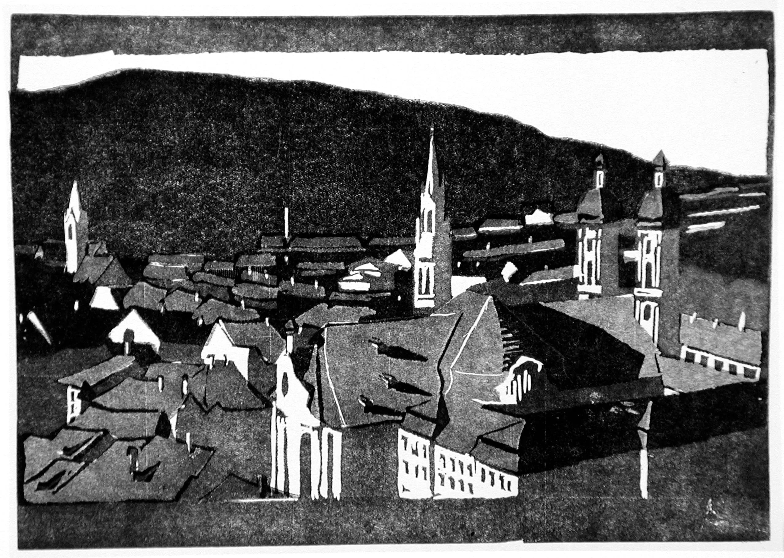 - Woodcut printed in gray, green, and reddish brown on wove paper