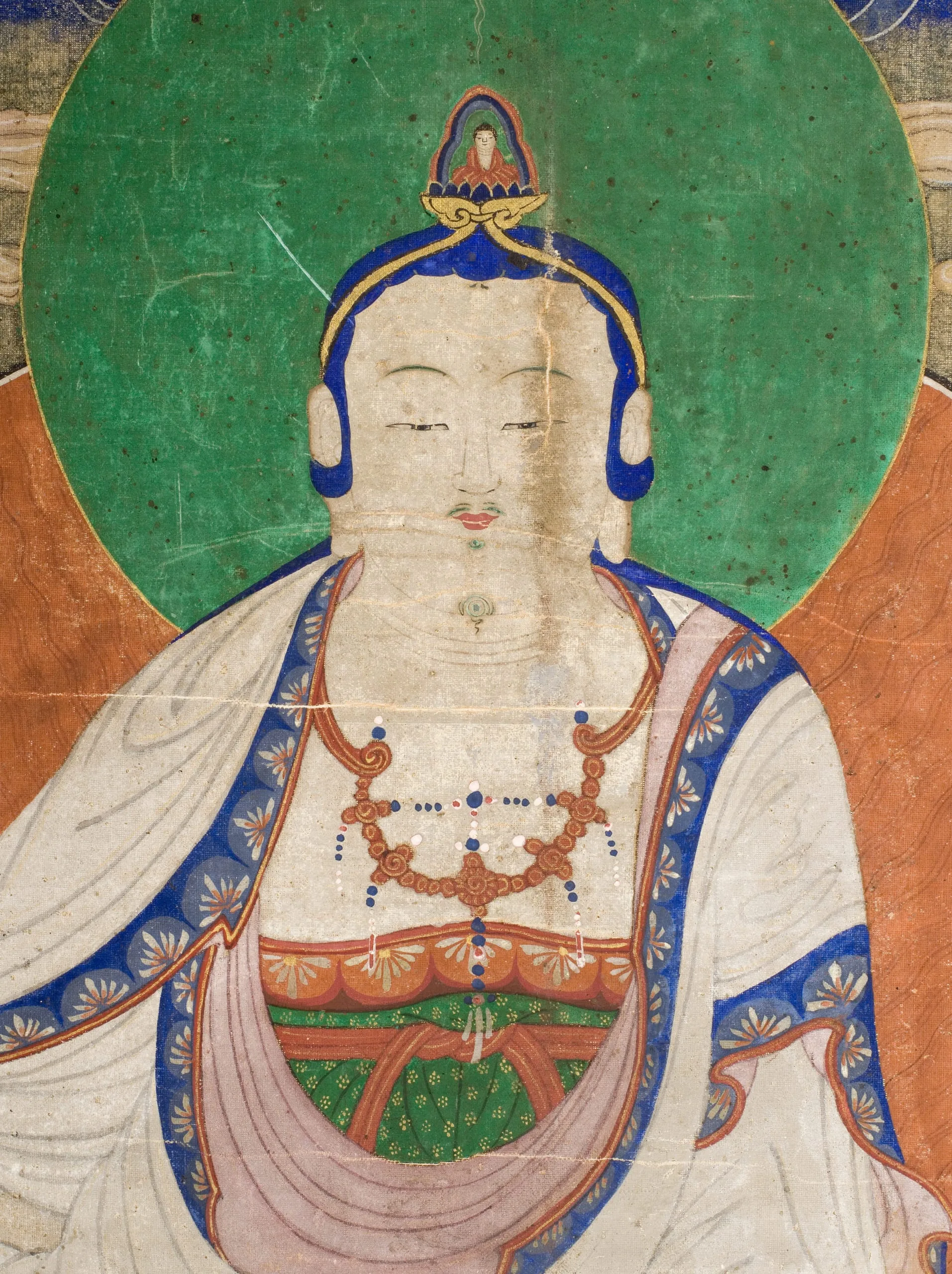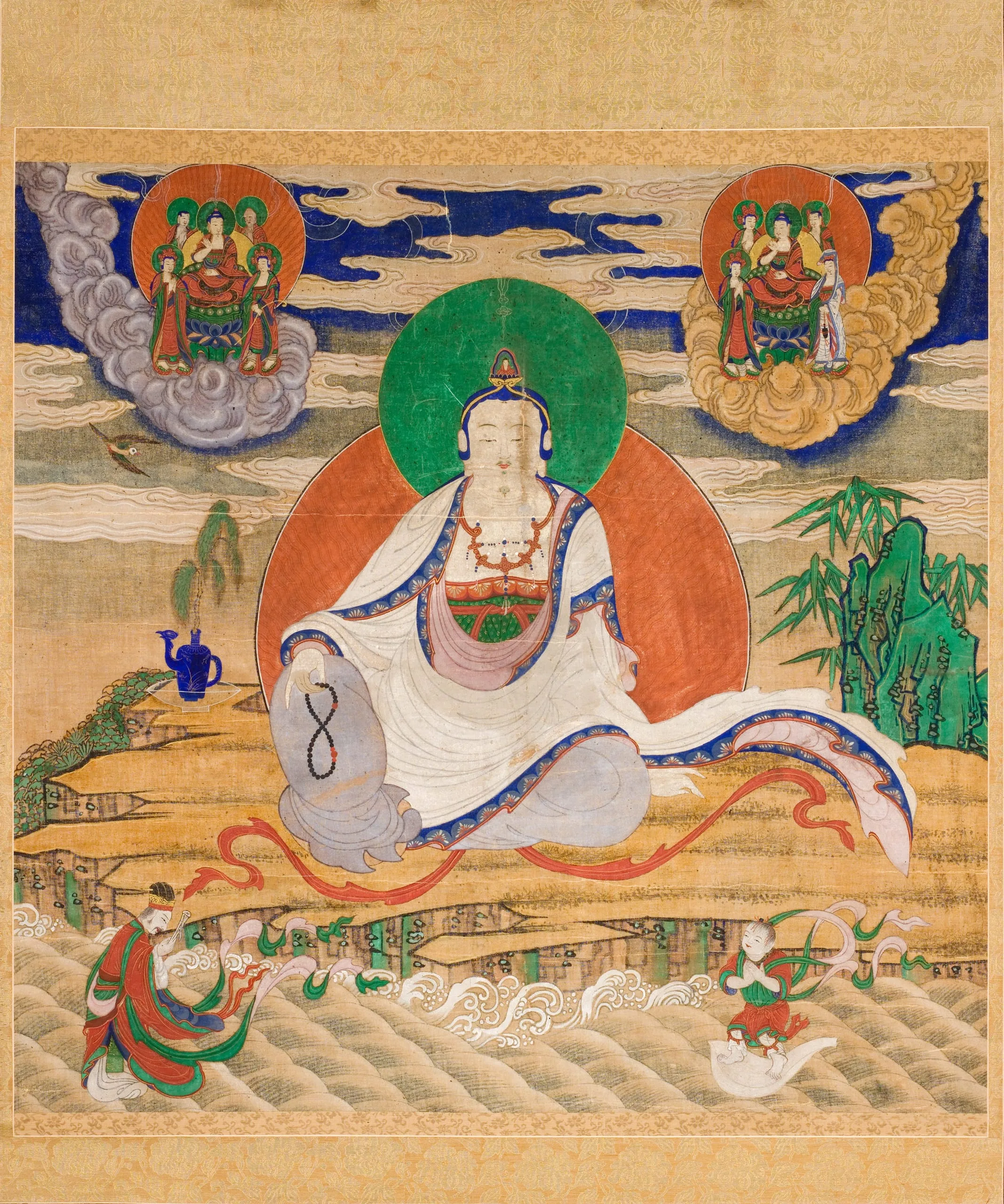 Similarly, there are only about thirty extant paintings of Gwaneum produced during the Joseon period, although many more are believed to have been created, despite the government’s official support for Confucianism and rejection of Buddhism.[3] This suggests that belief in Gwaneum was strongly persistent throughout all periods and among all classes. Artists in the Joseon period began to portray Gwaneum in a variety of poses, in addition to the half-lotus position (bangajwa) seen in paintings from Goryeo period: the bodhisattva was shown, for example, with legs half crossed and one knee raised (yunwangjwa), with legs completely crossed (gyeolgabujwa), and standing. Artists also began to include more characters, including the King and Queen of the Sea, birds, other Buddha images, Witaecheon, and Buddhist guardian deities such as the four heavenly guardians of Buddhism.[4]
