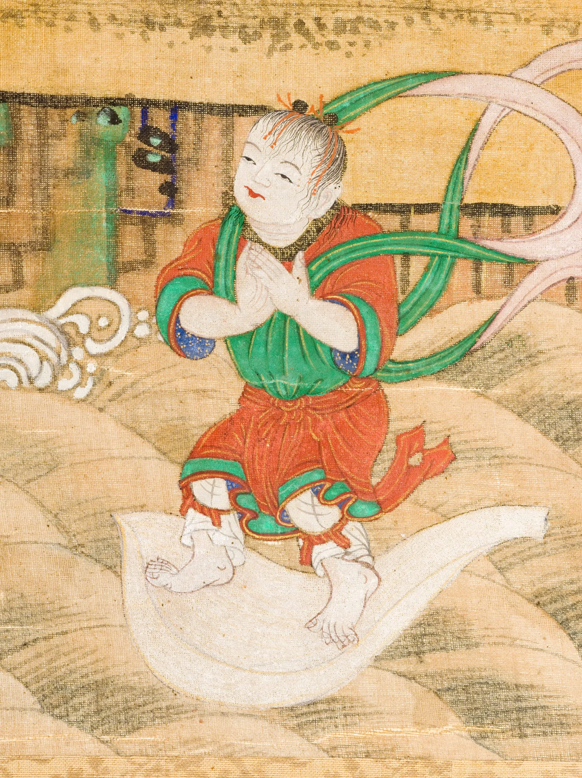 In a scene described in the Flower Garland Sutra, Gwaneum greets the disciple Sudhana (Seonjae dongja), who was on a journey seeking knowledge. This event – which is the subject of the LACMA painting – became the basis for the most common depiction of Gwaneum during the Goryeo period in Korea. Gwaneum is shown sitting on a rock probably intended to be Mount Botarak, the mountain near the ocean where the deity was believed to reside, and waves can be seen in the foreground. Holding Buddhist prayer beads in the right hand, the deity is in the yunwangjwa pose, facing forward. A green nimbus can be seen around the head, and a larger red nimbus surrounds the body. A water vessel (jeongbyeong), in blue, has a spout in the shape of a phoenix head; a willow branch has been placed in the vessel, which sits in a transparent bowl (det. 1). At the bottom left is the King of the Eastern Sea (det. 2); at the bottom right is Seonjae dongja, who holds his hands together and stands on a lotus (det. 3). At top left, on the purple cloud, is the Trinity of Buddha Shakyamuni (Seokga samjon), with Anan (Sanskrit: Ananda) and Gaseop (Sanskrit: Mahakasyapa), two disciples of Buddha (det. 4). At top right, on the yellow cloud, is the Trinity of Buddha Amitabha (Amita samjon)[5] with two additional bodhisattvas (det. 5).