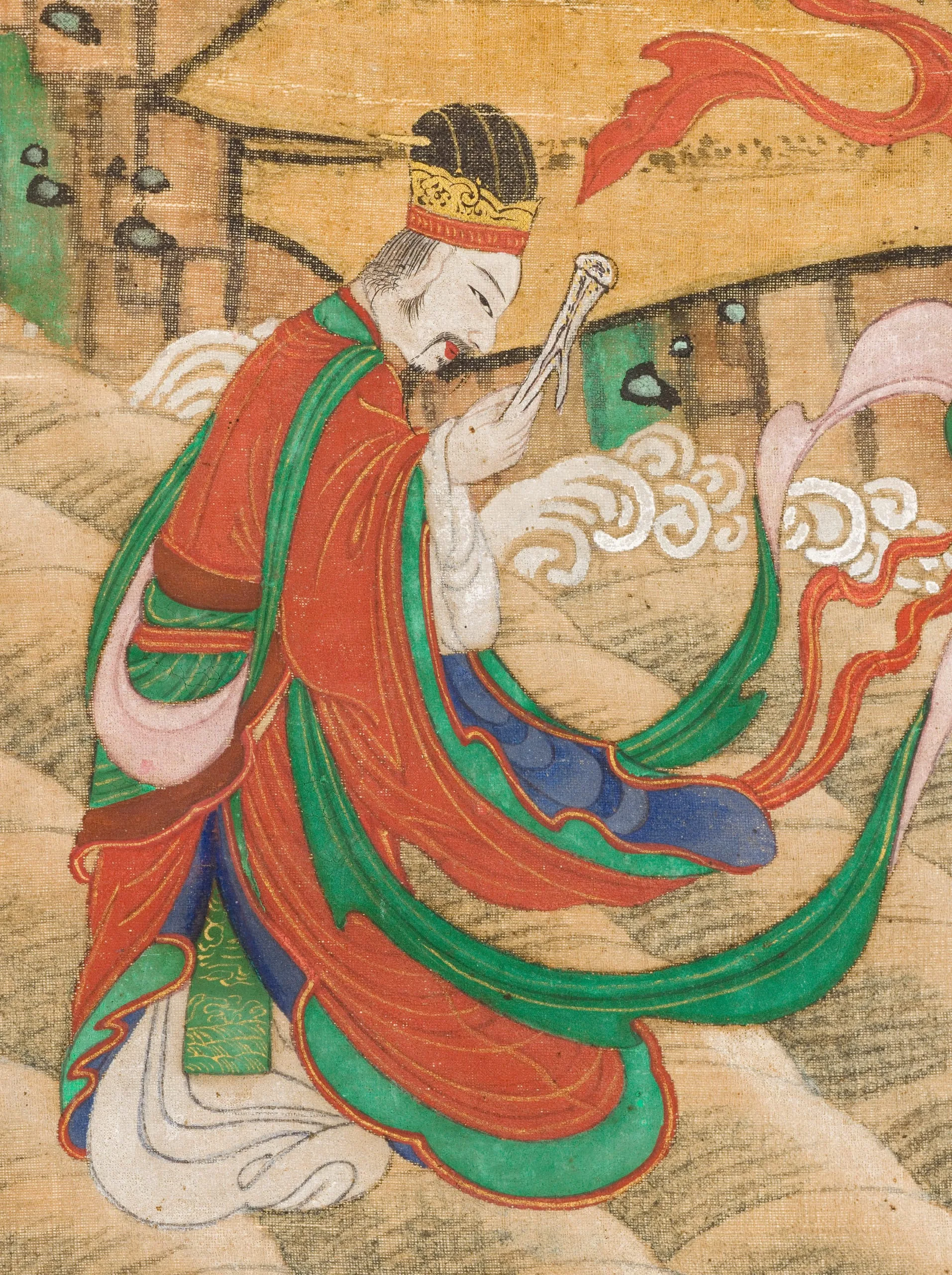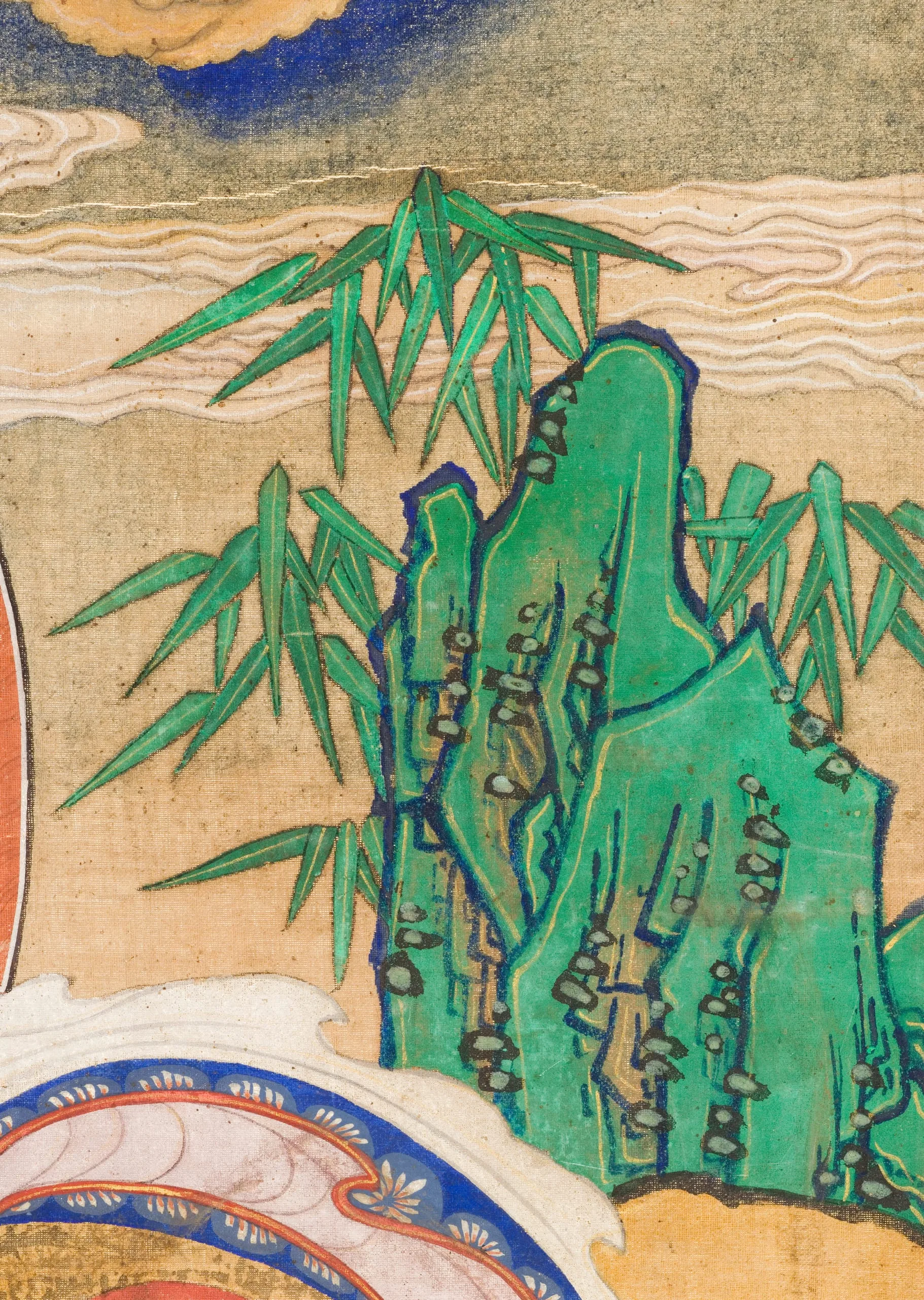 This hanging scroll was painted with ink, color, and gold on cotton. Gwaneum’s face is square with small features; a line of brown color was used for the facial features (det. 6). Yellow ocher was used for the flesh, and white pigment was used for the robes. Ink was applied to create the creases of the robe. The vermilion, blue, and dark blue border of the robe were first sketched with ink, then painted with pigment, and finally embellished with gold paint. An image of Buddha sits inside the diadem that Gwaneum wears as a crown. The relatively large ornaments on Gwaneum’s neck are standard iconography. Yellow ocher, white, and violet pigments were used for most of the background elements, such as the rock, clouds, and waves, with ink used to create details. A flower pattern, including gold-painted petals, was created on Gwaneum’s violet garment. The edge of the red scarf has a repeated pattern of a semicircular flower.