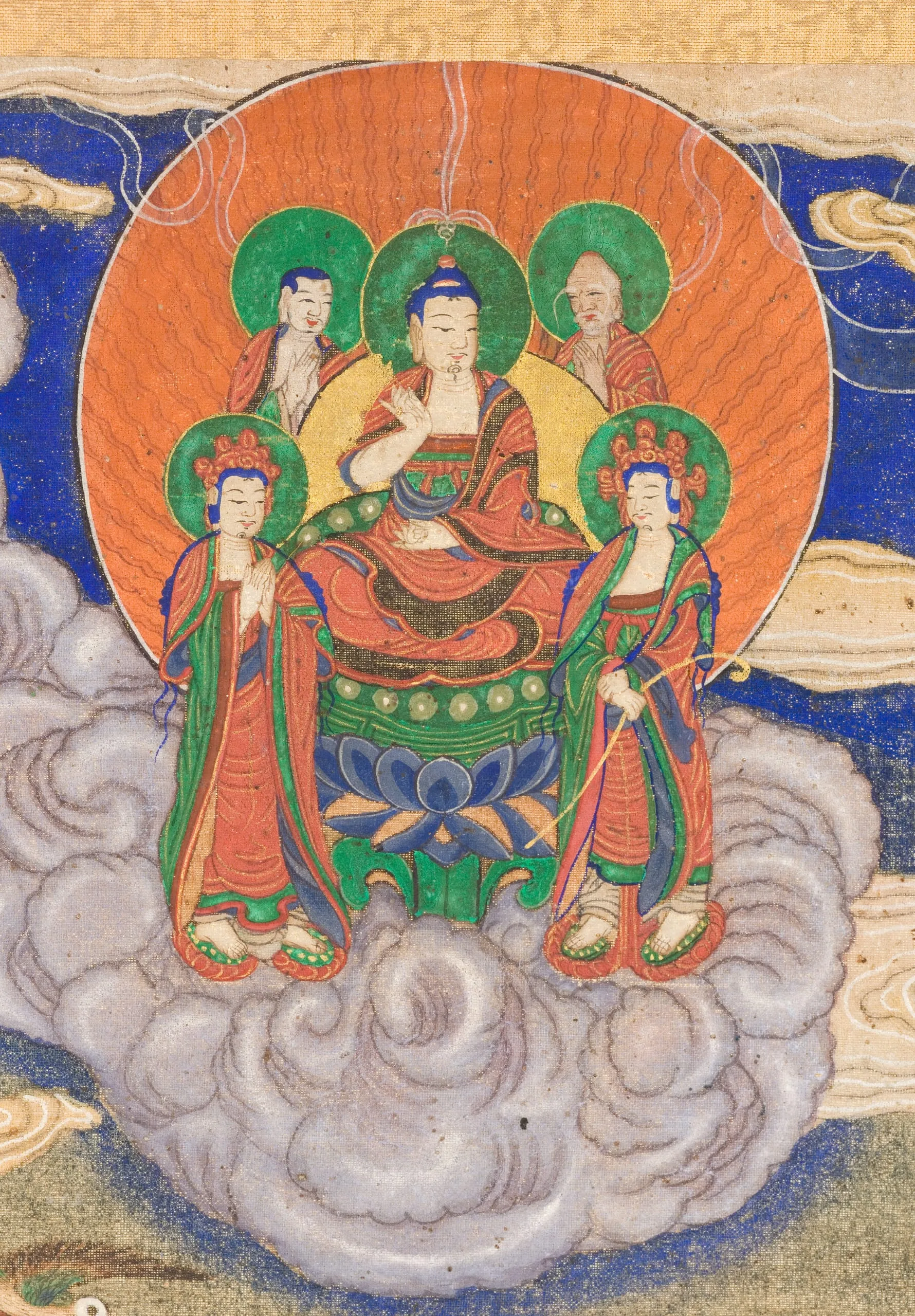 The inclusion of trinities of the Buddha (Yeorae samjon) is unusual in known paintings of Gwaneum, although a similar composition from 1897 exists in Beopju Temple, North Chungcheong province (fig. 4). In the Beopju Temple painting, however, Buddha is shown seated with a lotus near the pedestal and different guardians. These differences are presumed to be the result of disorganization in the iconography of the late Joseon period.