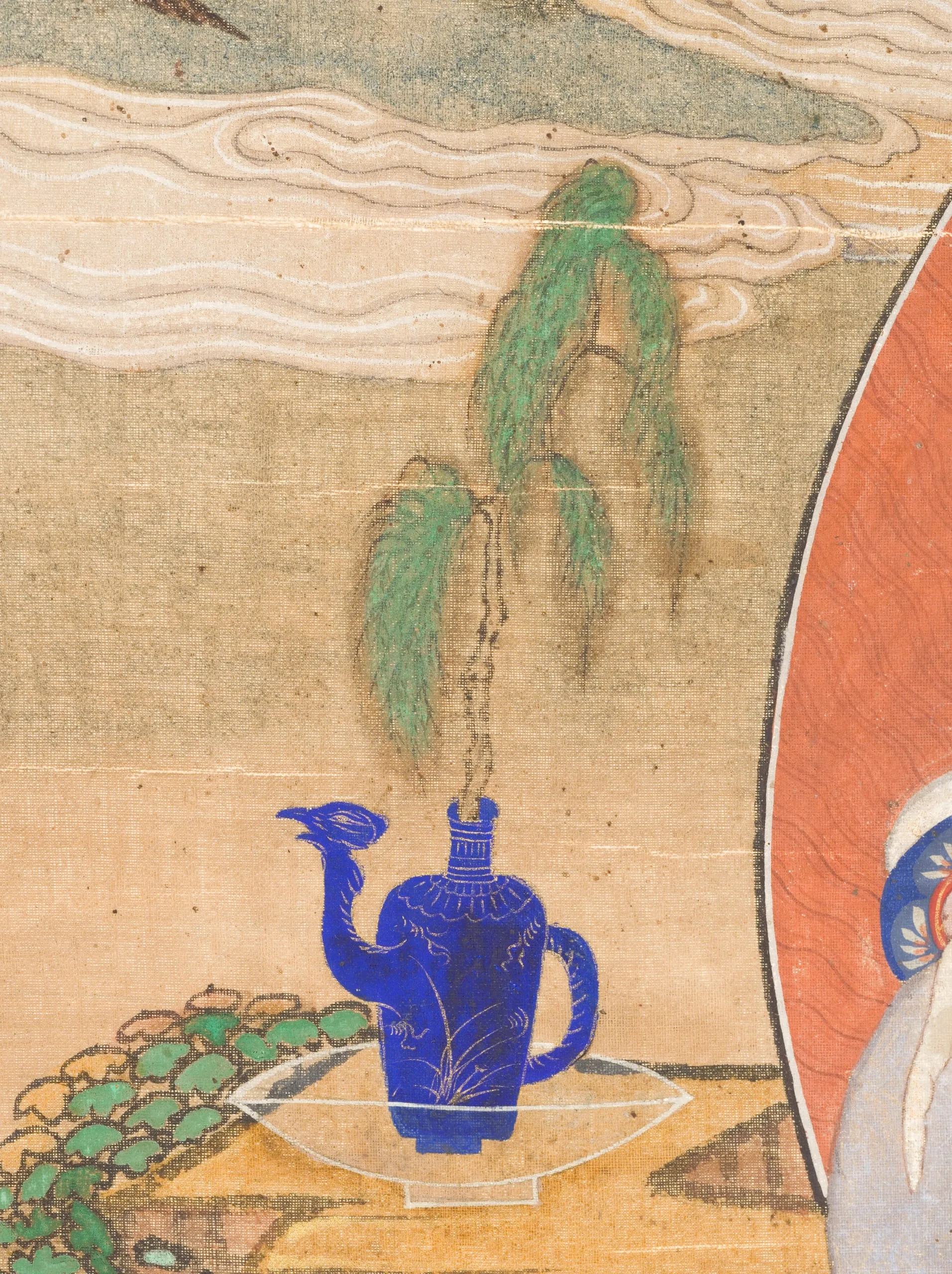 A water vessel with a similar phoenix-head-shaped spout also appears in a painting of Buddha from 1886 at Hwagye Temple, Seoul, Gyeonggi province, although the one seen in the LACMA painting is more formalized. This type of decoration also appears on a kettle and vase in a painting of sixteen nahans from1884 at Jingwan Temple, Seoul, Gyeonggi province, leading scholars to believe it was popular in the Gyeonggi province at the end of the nineteenth century.