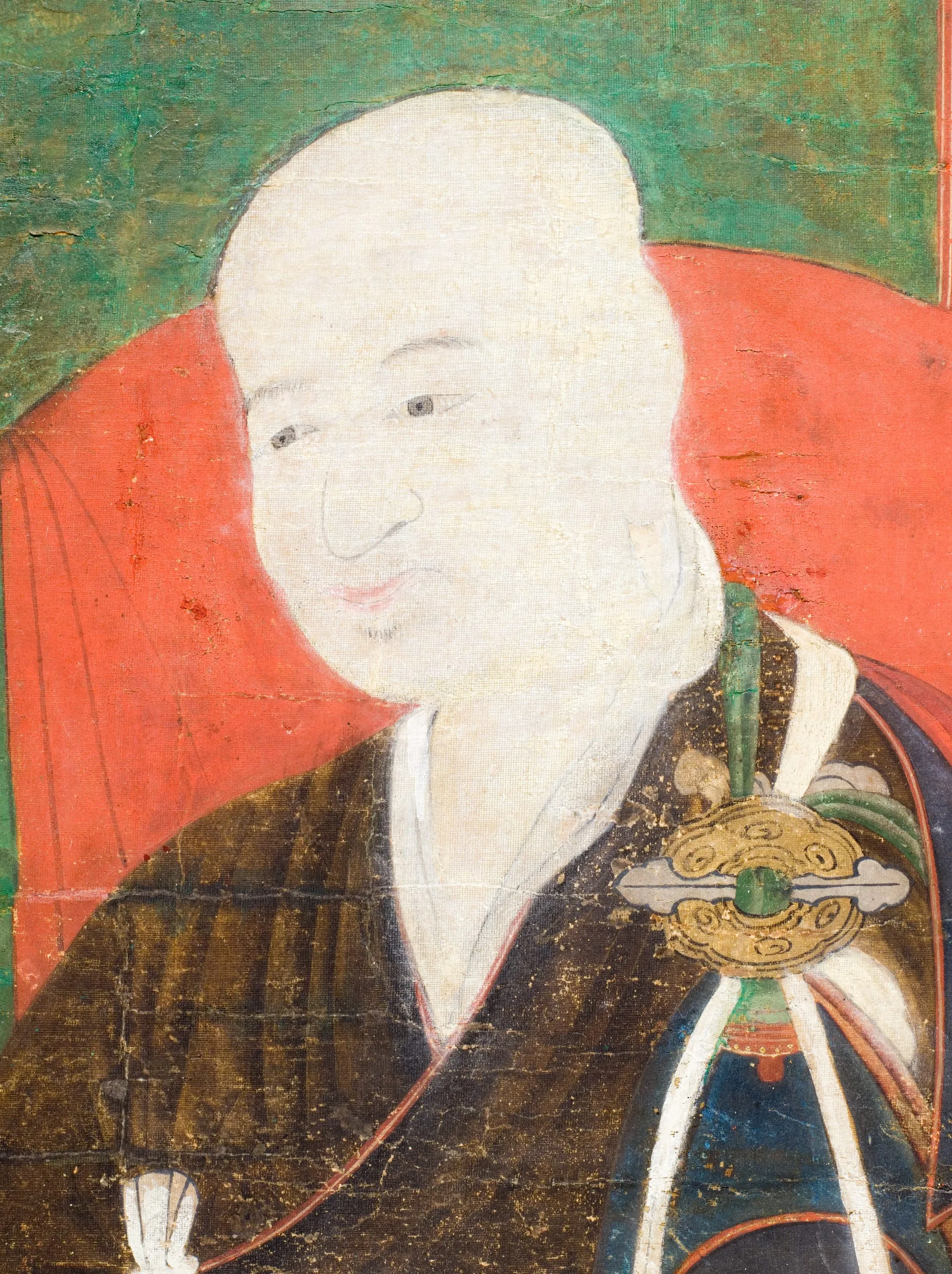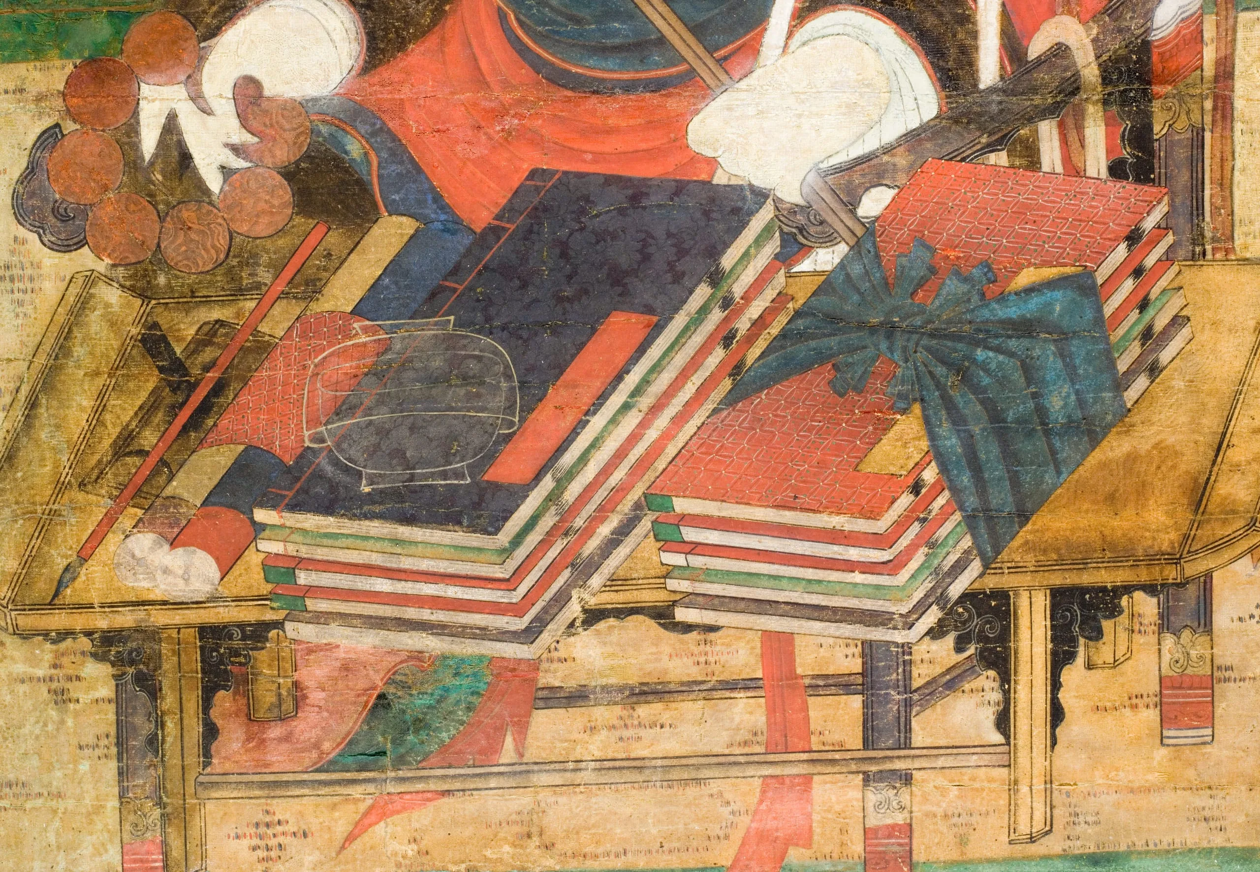 The overall composition and color scheme, as well as the subject’s pose, indicate that the portrait was created at the end of the nineteenth century. Another painting, the Portrait of the Great Monk Eunheodang from 1868 at Yongmun Temple, Gyeonggi province, similarly depicts the monk seated before a table with sacred books (fig. 1).