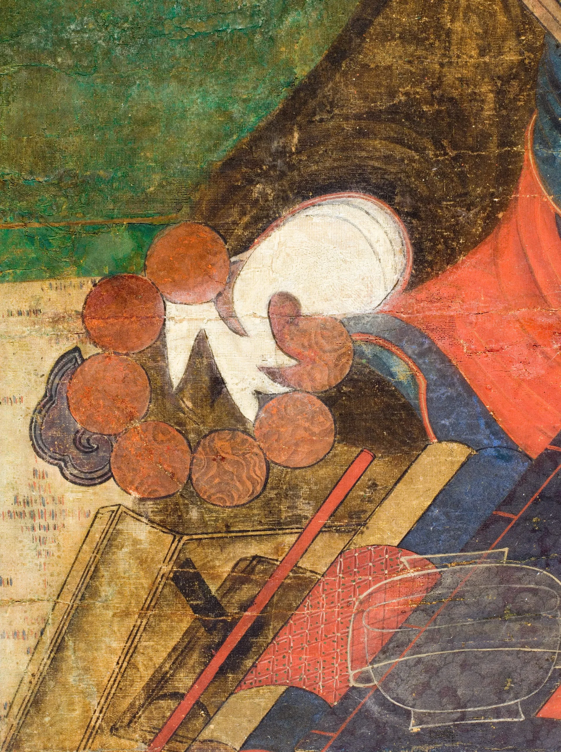 Typical of the genre, the floor mat and wall create a divided background. Pyeongweondang, facing left, sits in a low chair. In his left hand, he holds a Buddhist wooden staff (Sanskrit: khakkhara) and, in his right hand, he holds Buddhist prayer beads (det. 1). On the low table in front of him are ten sutras, two scrolls, and writing implements including a brush, ink stone, and ink (det. 2). A transparent lidded container sits atop one stack of sutras. Pyeongweondang’s face is unwrinkled and his lips are pursed (det. 3). The artist used a complex painting technique: he first applied white paint to the back of the silk for the face, and then thinly applied an ocher hue from the front. Most of the original color has since been lost. It appears that the robe’s white knot, below the patriarch’s right shoulder, was repainted.