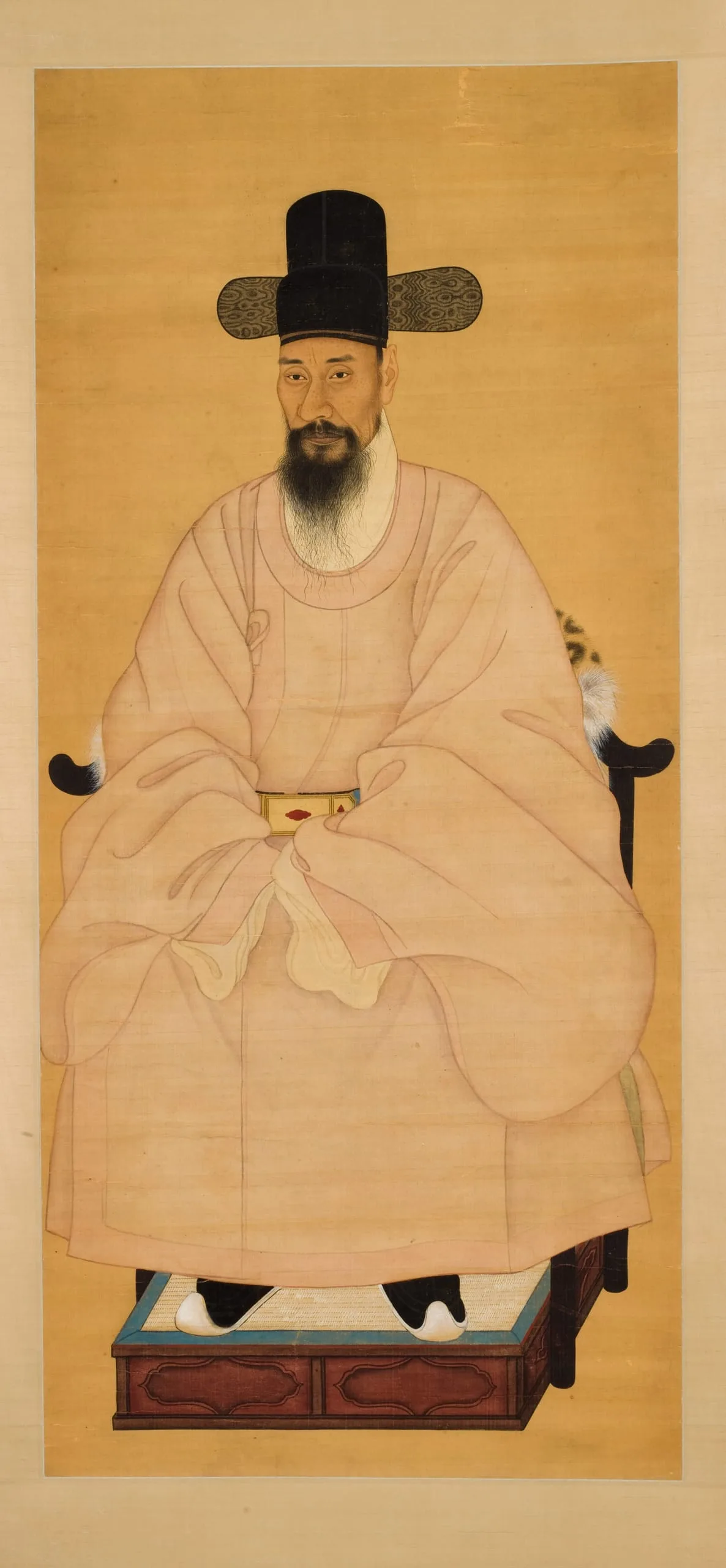 Because the painting does not include a signature or inscription, the identity of the sitter and the artist are unknown. The sitter wears an official’s robe without a rank badge.[4] This type of robe, called a sibok, was made of cotton or hemp rather than the high-quality silk used for the formal garments of the officials, which include rank badges.[5] An official wearing a sibok also usually wore a black hat, a belt, and wooden shoes, seen here. The sibok – a practical garment for daily activities – was either pink or blue. Because officials of the highest three ranks wore pink and those of lower ranks wore blue, the subject of LACMA’s portrait was clearly a high-ranking official.