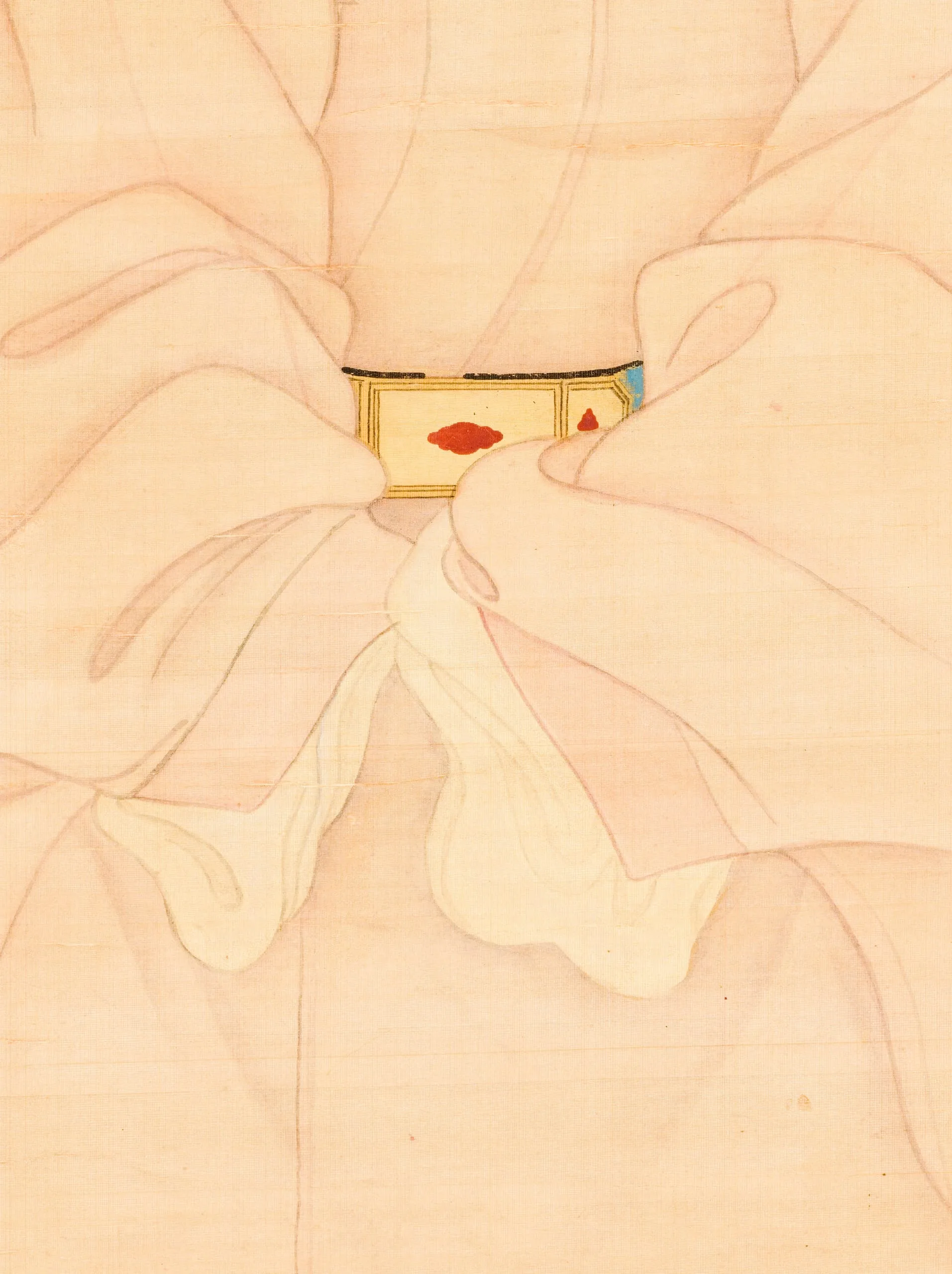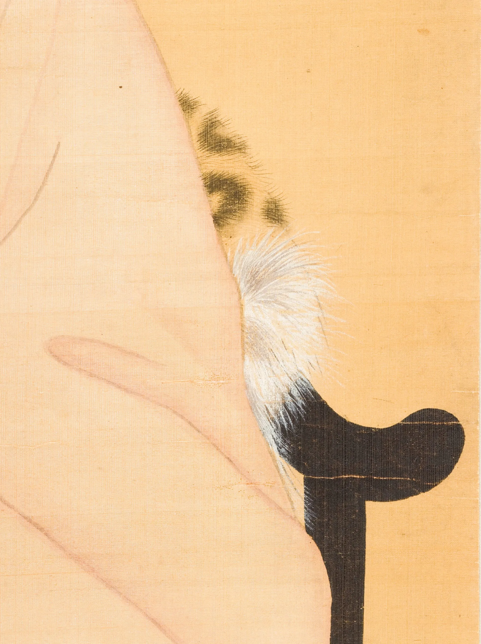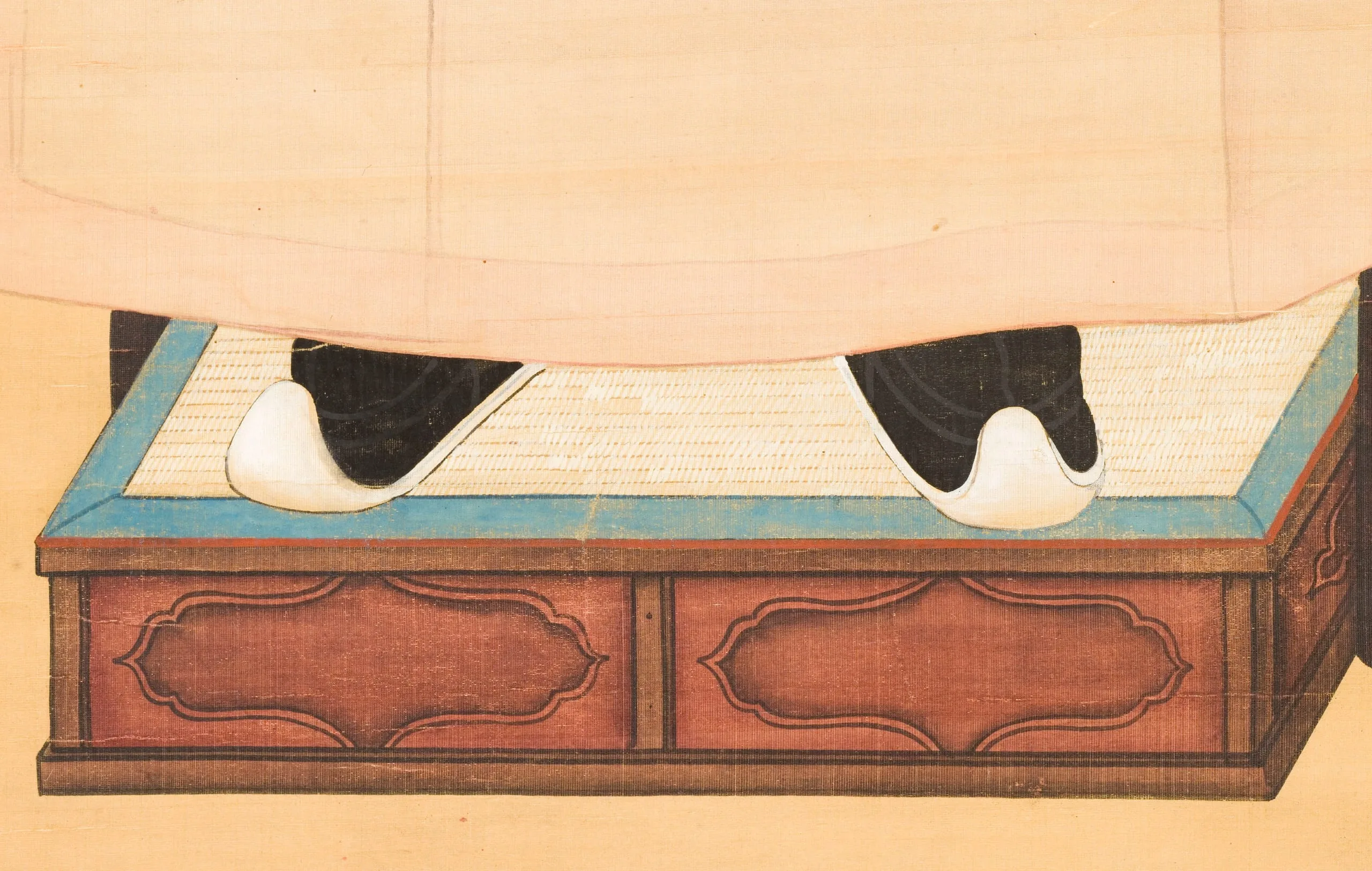 The background of this painting is plain – there is no exotic carpet or traditional Korean mat on floor – and the sitter’s feet rest on a simple wood footstool (det. 2). This unadorned portrait style first appeared in the eighteenth century and continued through the nineteenth century. The artist has used Western shading techniques, which can be seen, for example, in the face and in the creases of the robe (det. 3). Because these Western techniques were commonly used in nineteenth-century portraits, this portrait can be dated to the nineteenth century.