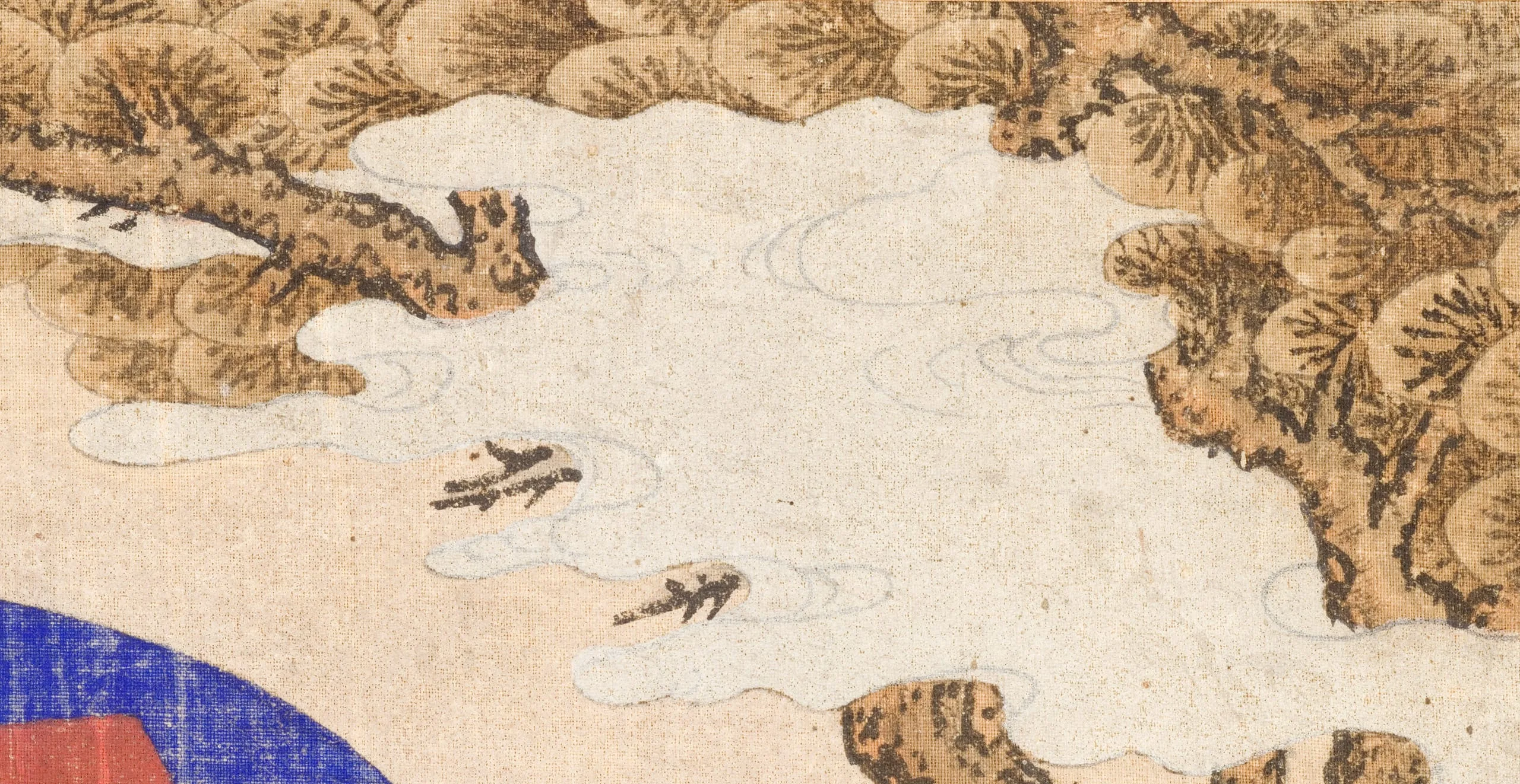 This painting depicts a red-robed mountain god sitting on a wooden chair on a steep mountain slope. He wears a king’s crown mounted with two books (det. 1). He sits with his right foot on his left knee and turns to the left; his mouth is open, as if he is talking to someone, and he strokes his beard with his left hand. A tiger crouches at his feet, looking up (det. 2). The position of the tiger suggests that he ran down the mountain and made a hasty, sharp turn in front of the mountain god; however, the connection between the tiger’s tail and the rest of his body appears unnatural. Behind him on the slope of the mountain is a pine tree with clouds among its branches, and the scene suggests a sublime place where the mountain god resides (det. 3).