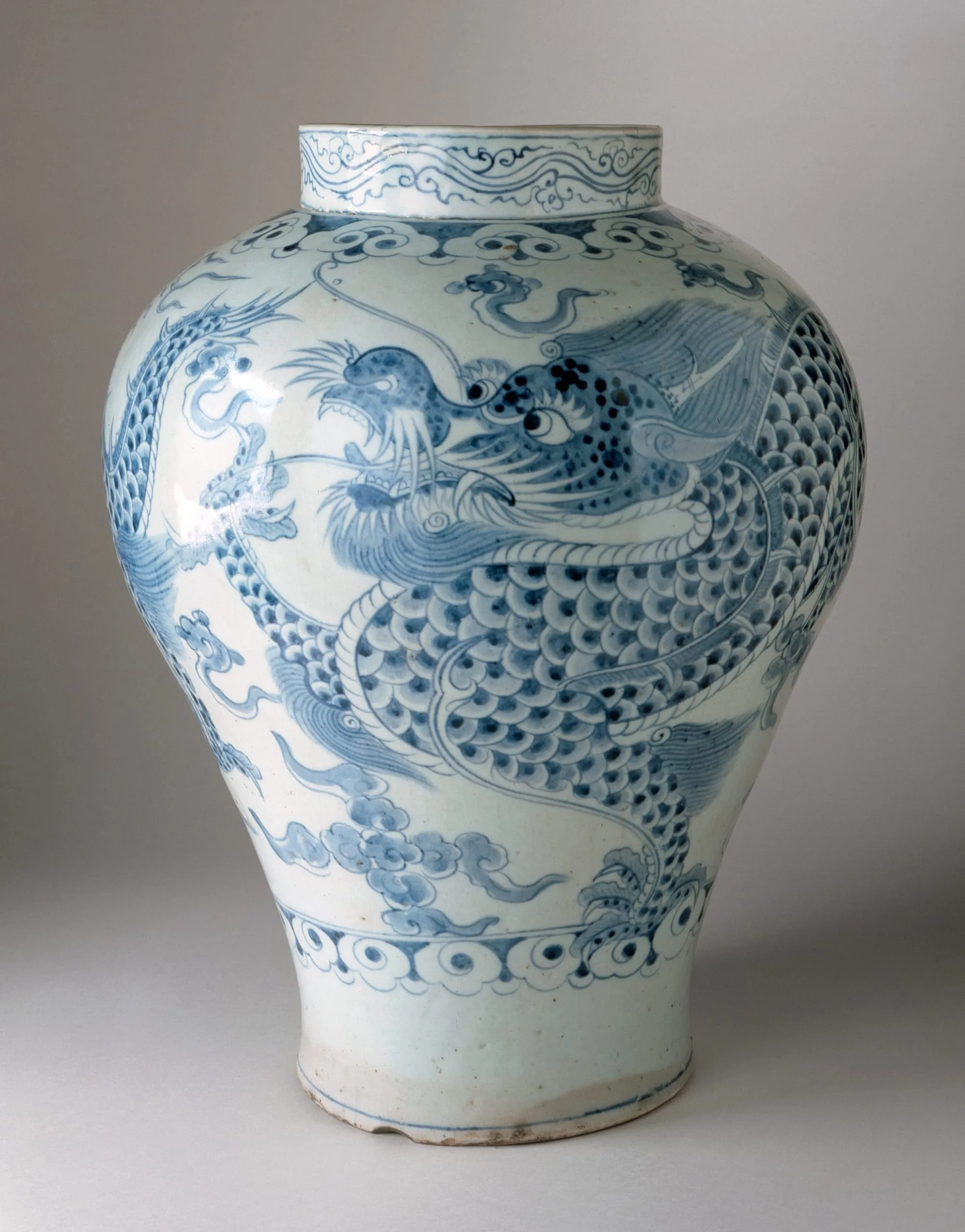 Many porcelains were produced in the late eighteenth century at the royal kilns in Gwangju, near the Joseon capital of Hanyang (modern Seoul). Court painters were frequently employed to paint the surface designs. Beautifully painted, this jar features a scaly dragon with big friendly eyes, sharp teeth, small horns, and a lively mane. Considered auspicious throughout East Asia, the dragon symbolizes royalty and prosperity. This boldly painted creature attests to the brush of a skillful court artist and anticipates later decorative trends in court and folk painting. A fine example, this robust, elegant jar illustrates the well-balanced form and relatively short mouth rim characteristic of eighteenth-century wares.