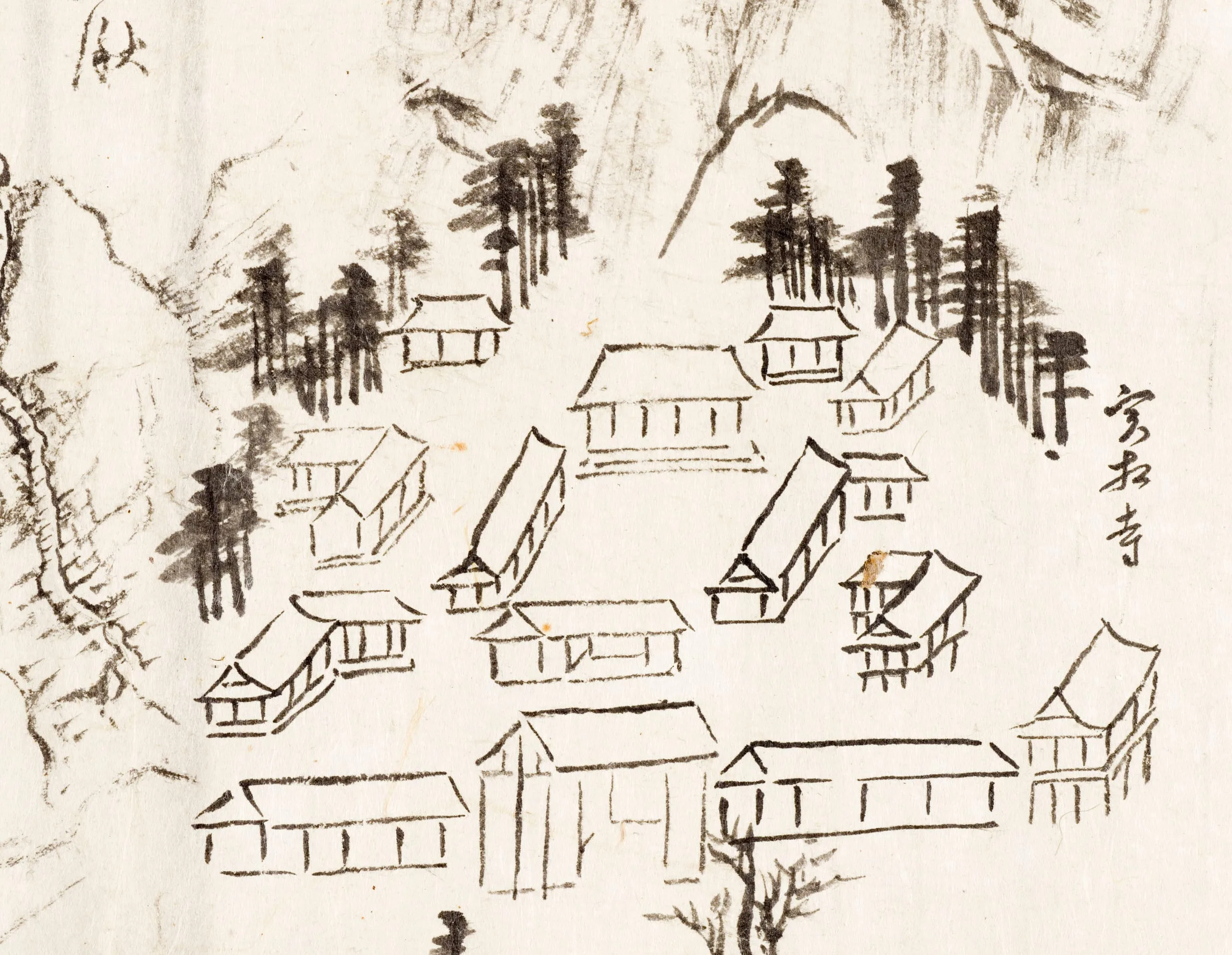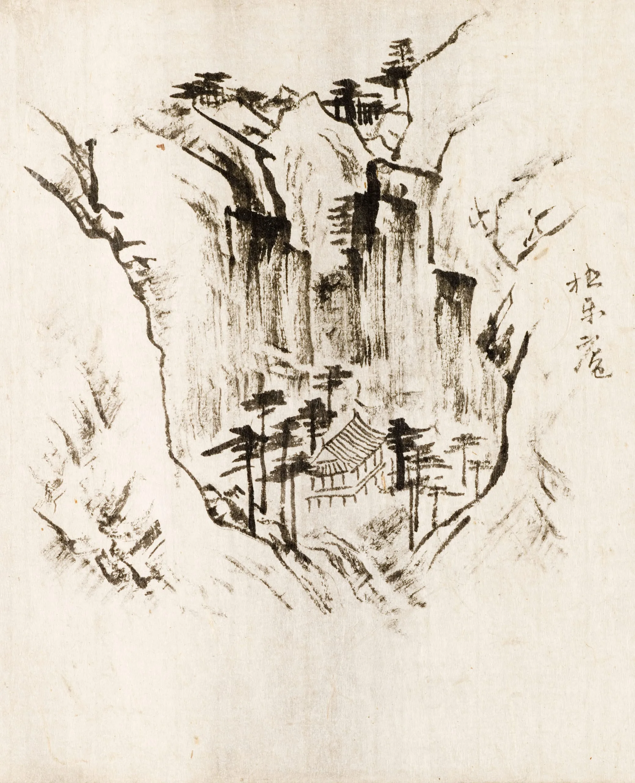Although all the scenes are sketched in ink, and apparently in a short period of time, possibly while he was traveling, they faithfully convey the feeling and atmosphere of each location. When compared to a similar true-view scenic painting by Gang depicting Dosan Academy (fig. 3; National Museum of Korea), LACMA’s painting is much more sketch-like and conveys a greater sense of immediacy. It is possible that LACMA’s group of drawings was produced as a private travel record for the artist so that he could paint the subject later in a true-view landscape; however, there is no record of any such painting.