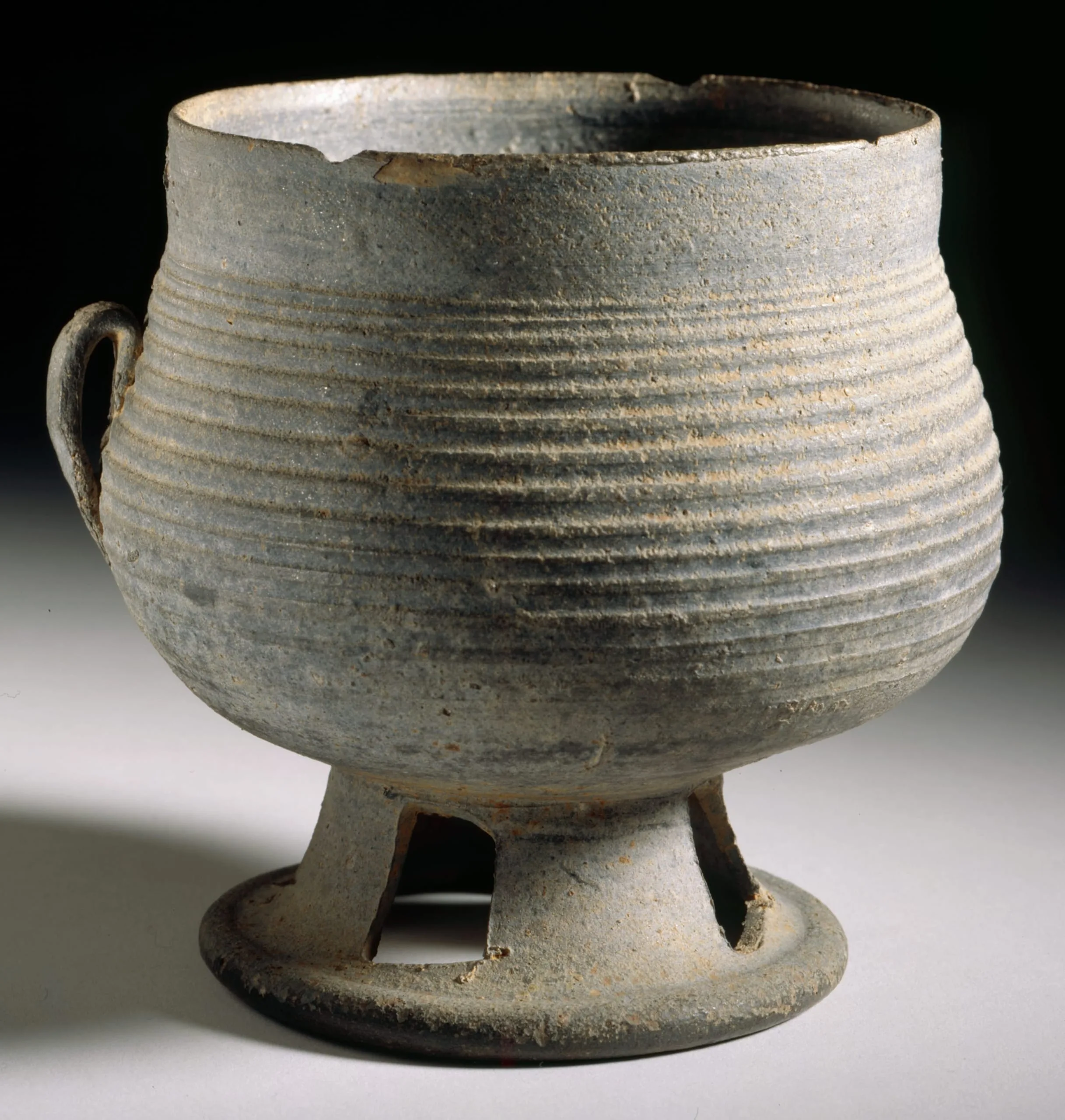- Wheel-thrown stoneware with combed, modeled, and applied decoration