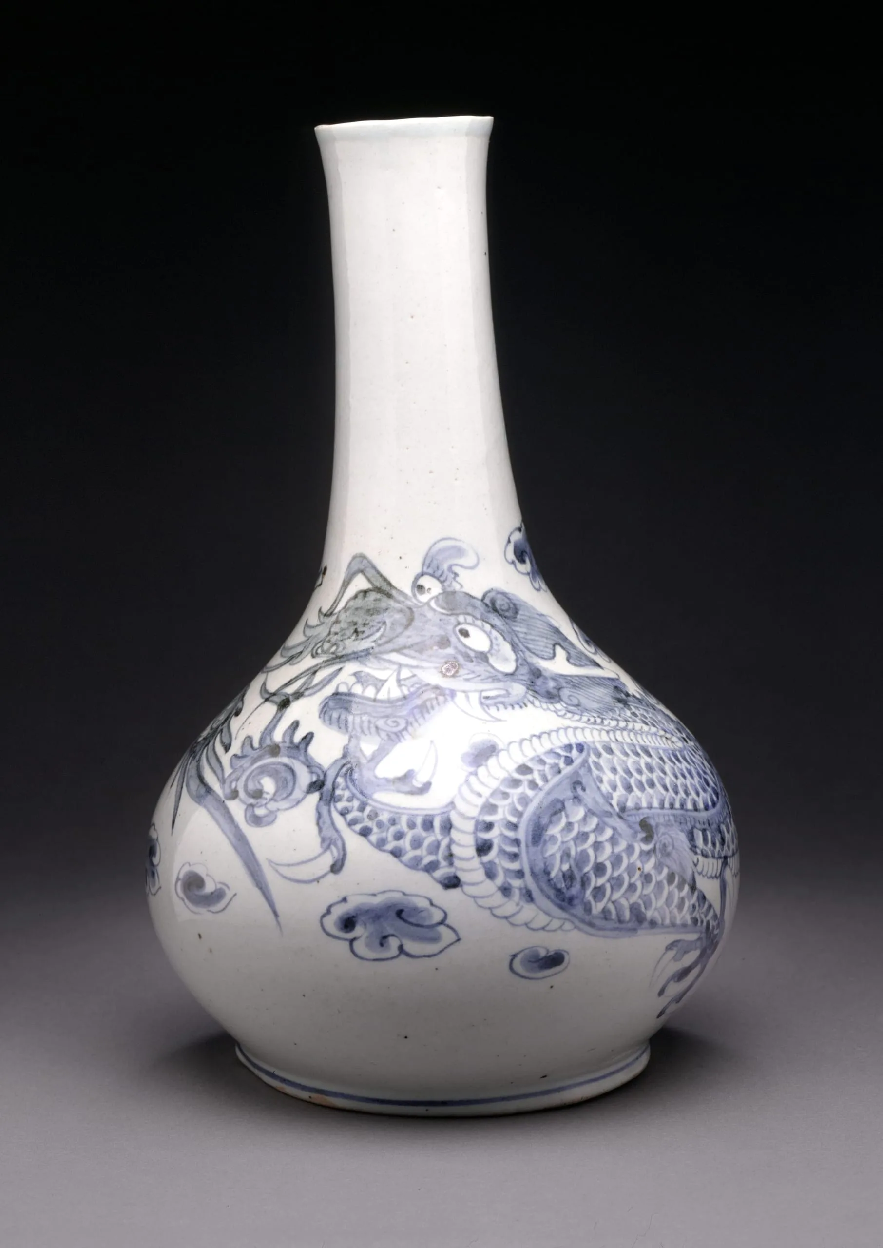 - Wheel-thrown porcelain with blue painted decoration under clear glaze