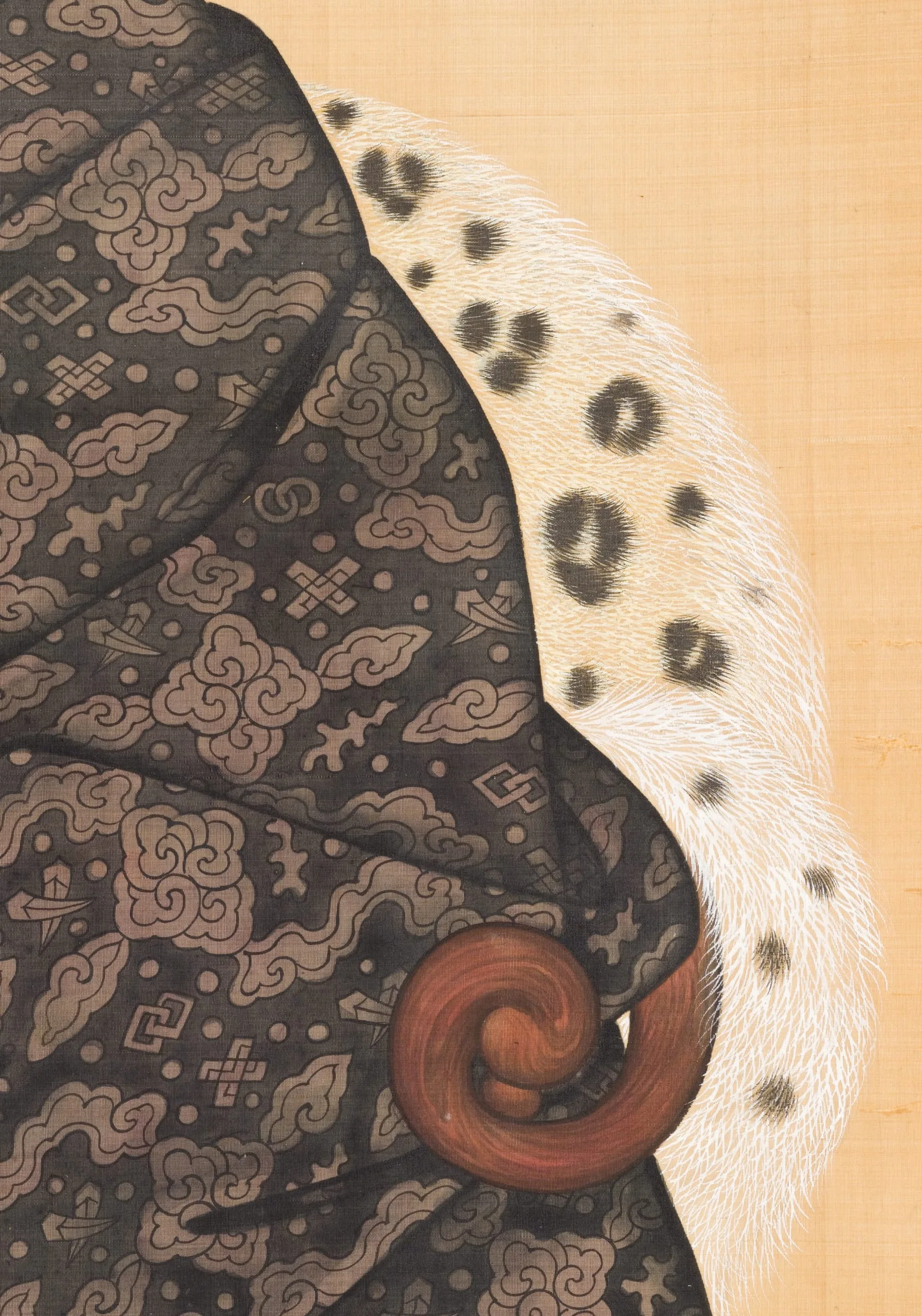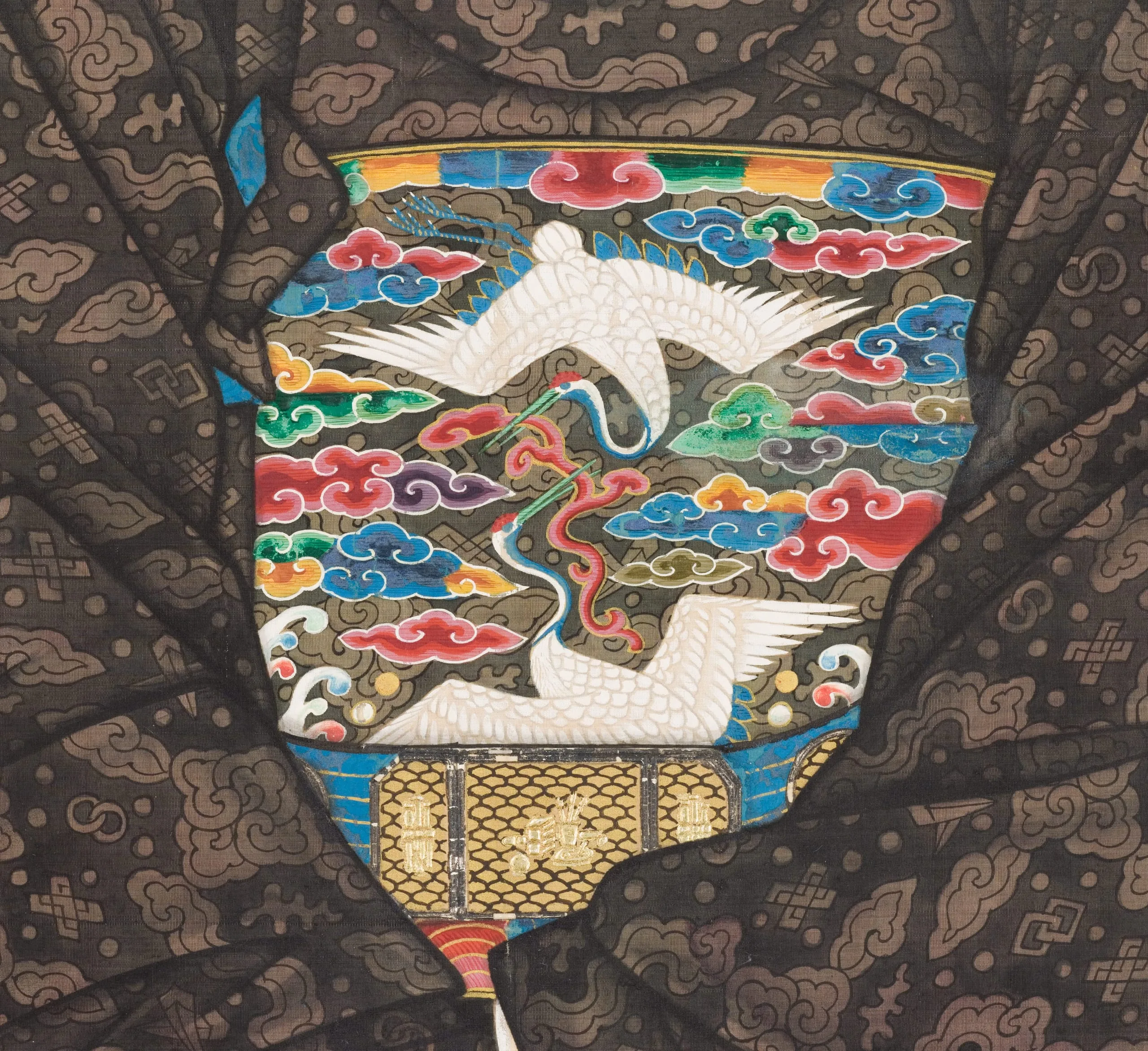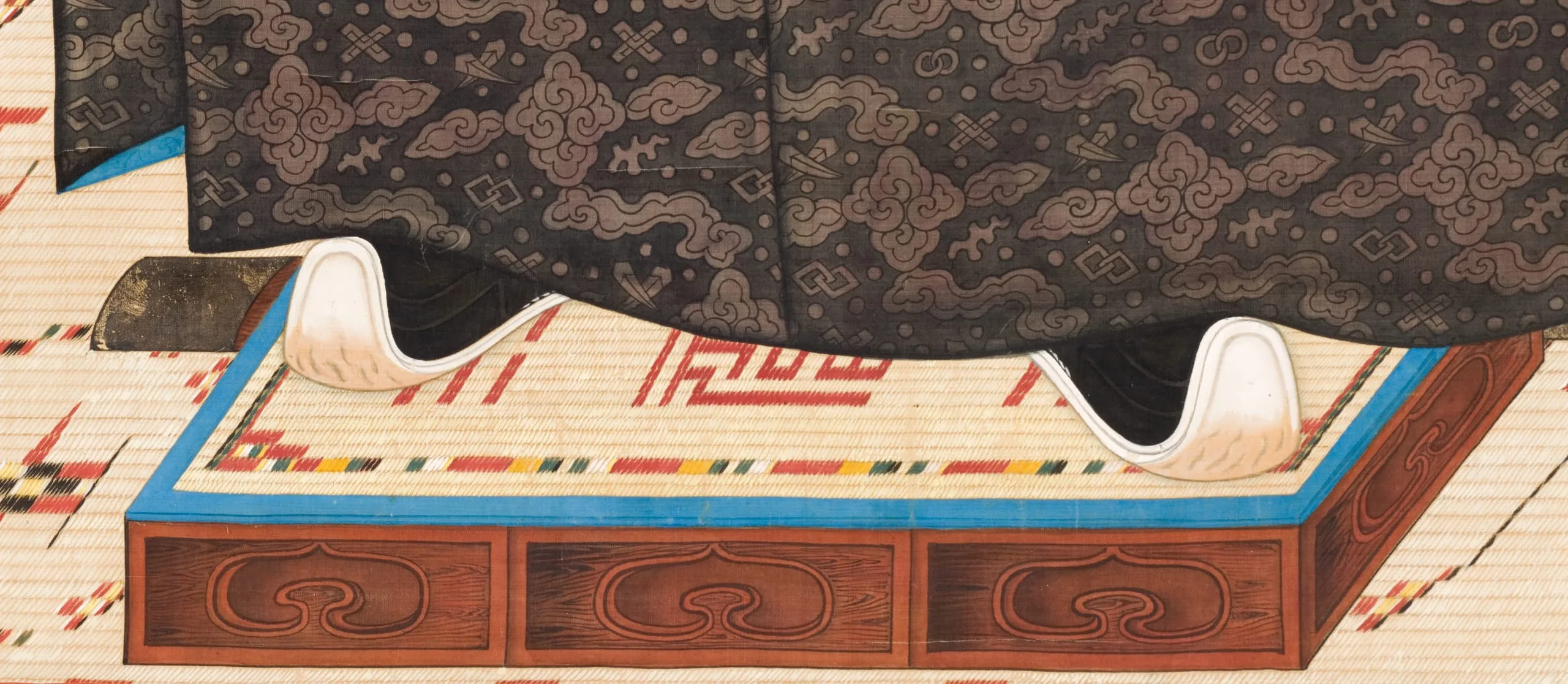LACMA’s portrait is characteristic of nineteenth-century portraiture style.[2] At the beginning of the nineteenth century, a traditional Korean mat began to appear as the most common flooring, replacing the previous standard of a foreign carpet ground. It was also during the nineteenth century that a footstool was added – often covered with the same mat flooring – as exemplified in LACMA’s portrait. Other details typical of the nineteenth century include the tall proportion and stiff appearance of the official’s hat.