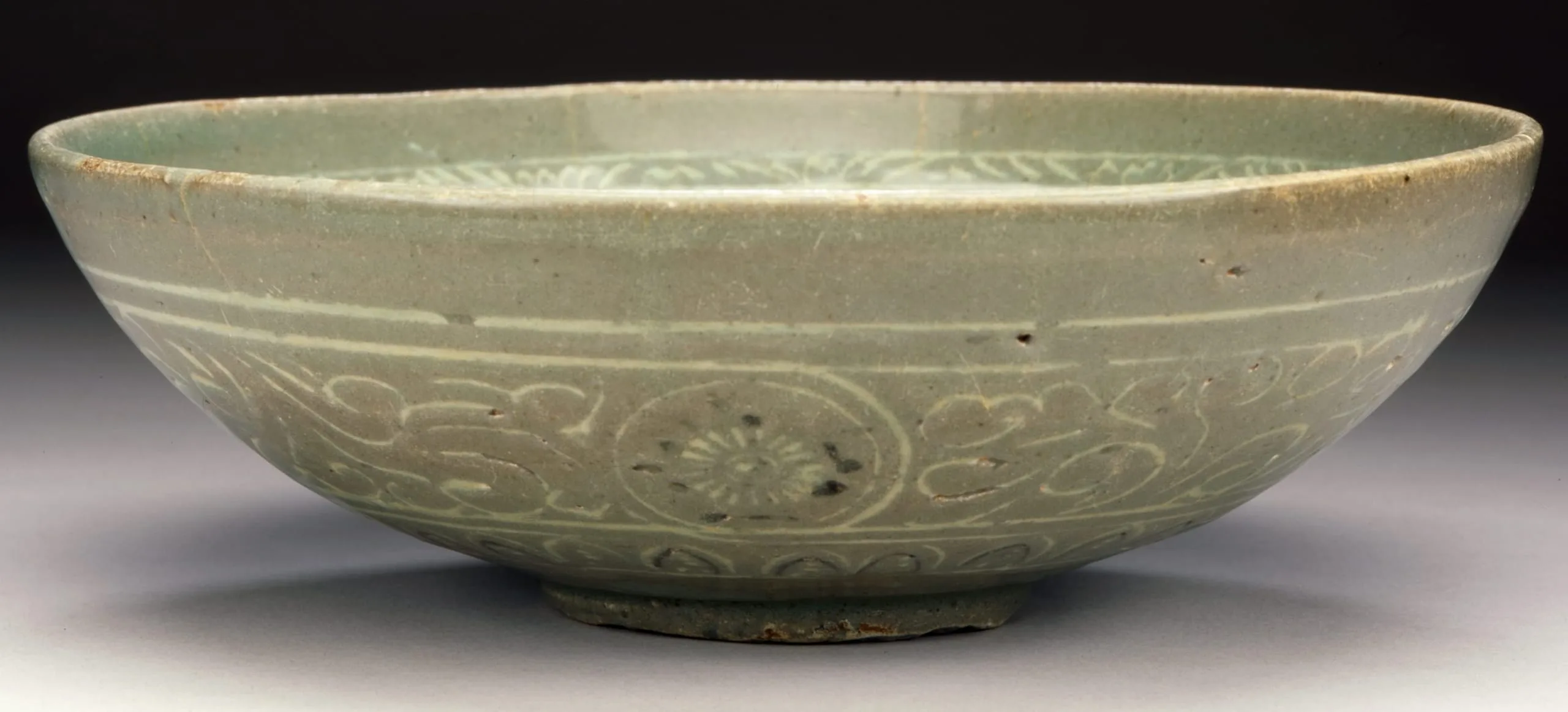 - Wheel-thrown stoneware with incised and slip-filled decoration and green glaze