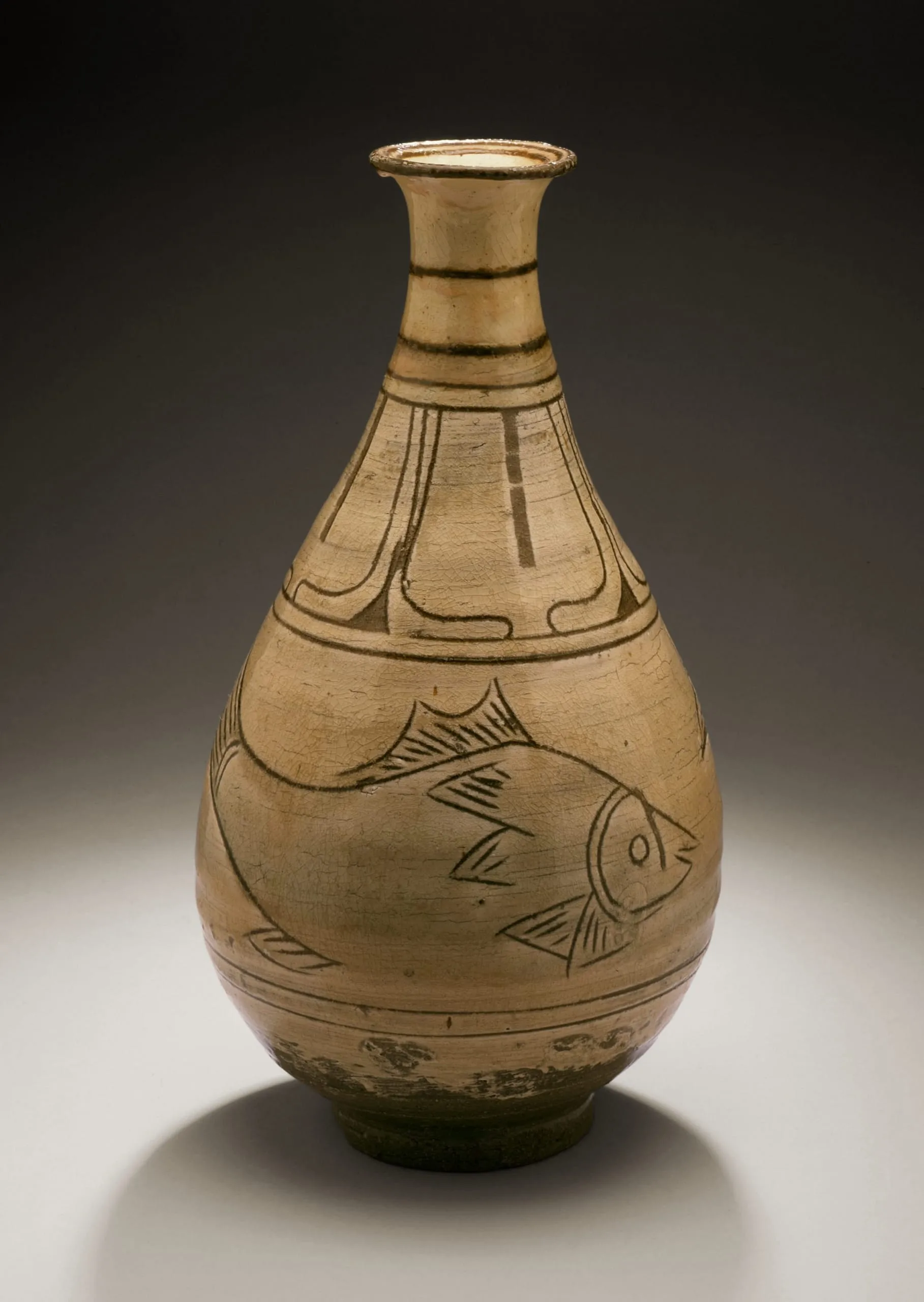 - Buncheong ware; Wheel-thrown stoneware with incised slip decoration and pale green glaze
