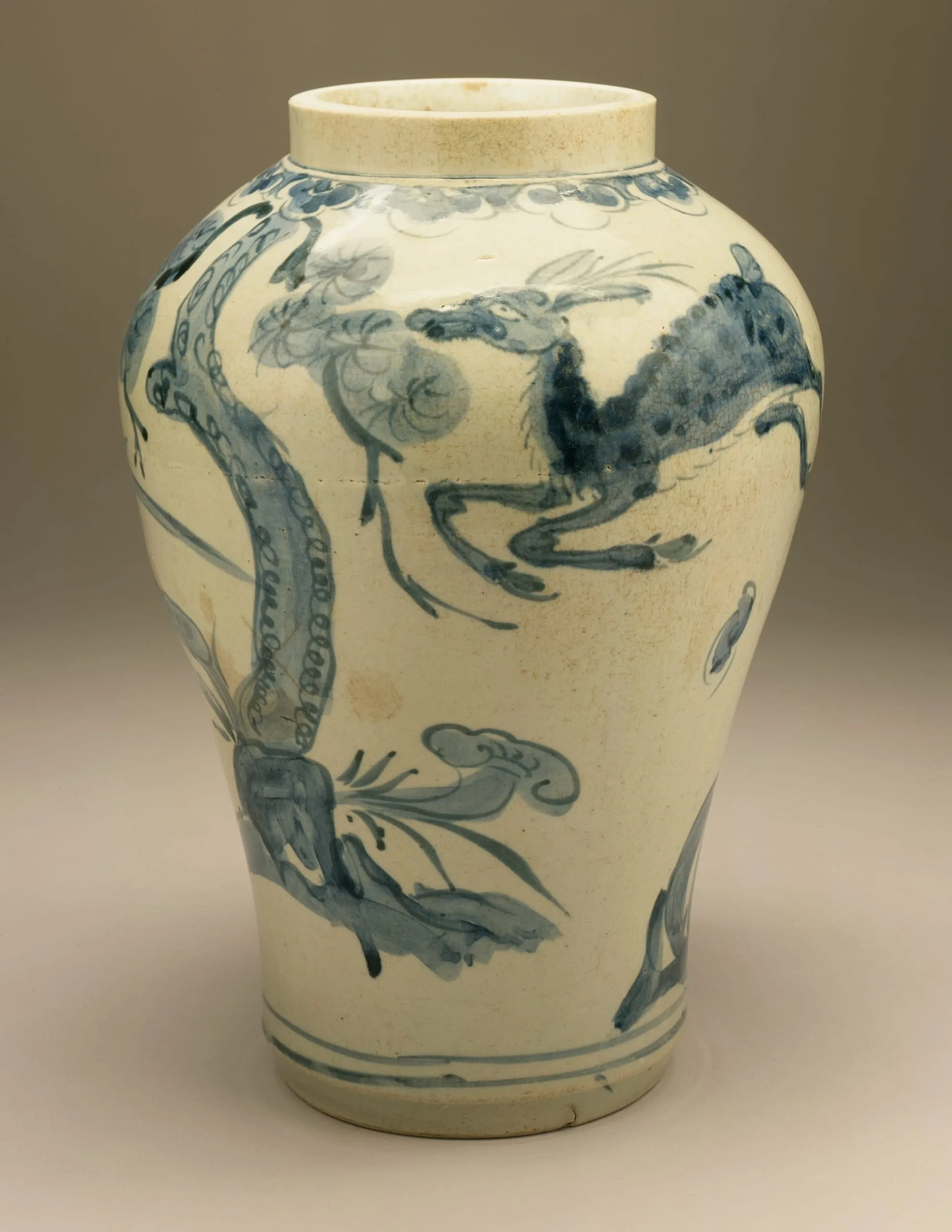 - Wheel-thrown porcelain with underglaze blue painted decoration under clear glaze (cheonghwa baekja ware)