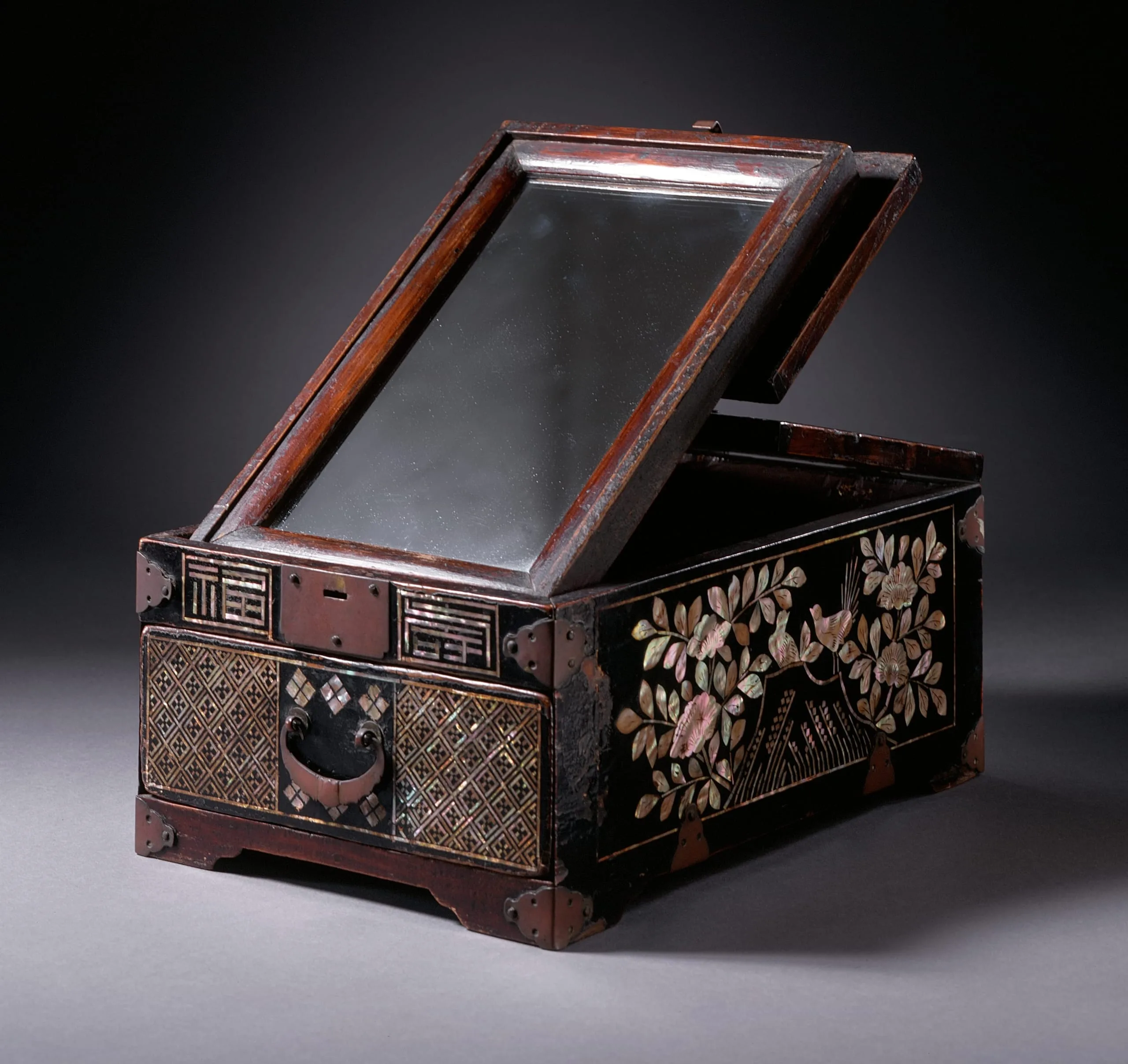 - Brown lacquer on wood core with mother-of-pearl inlay, brass fittings, and silvered glass
