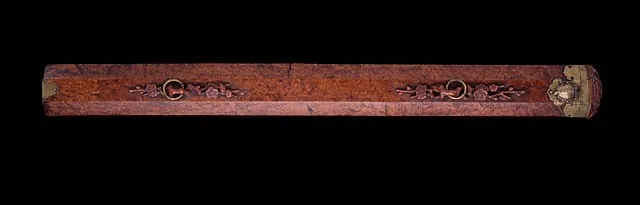 - Burlwood veneer on wood core with carved and applied decoration and brass fittings
