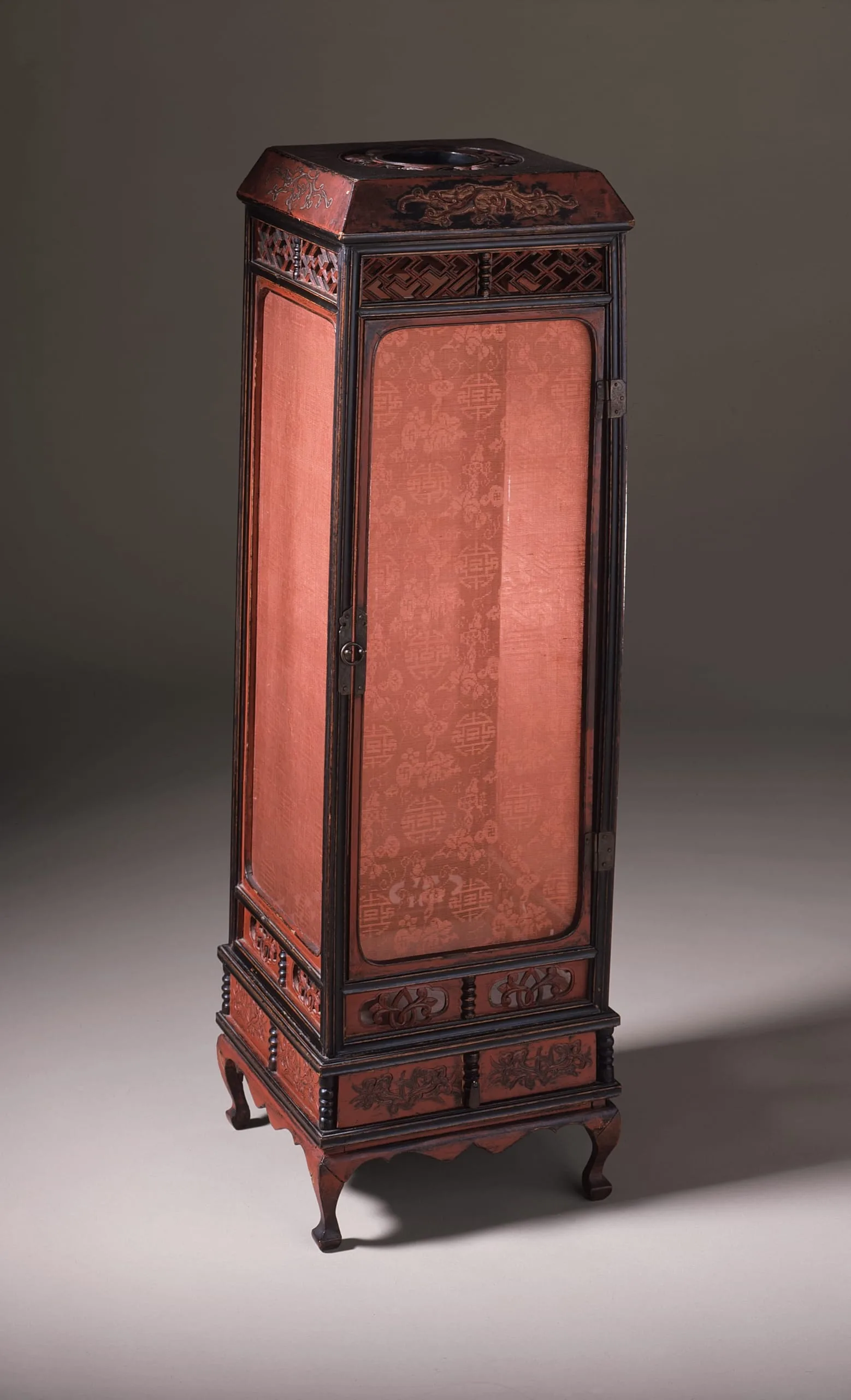 - Carved wood with red lacquer, gilding, and Chinese silk gauze