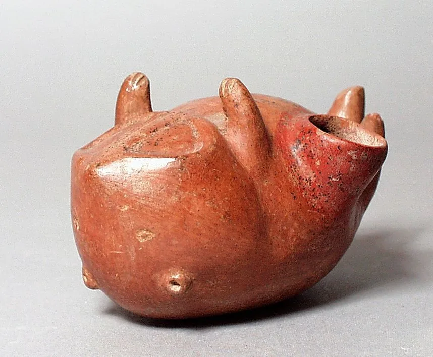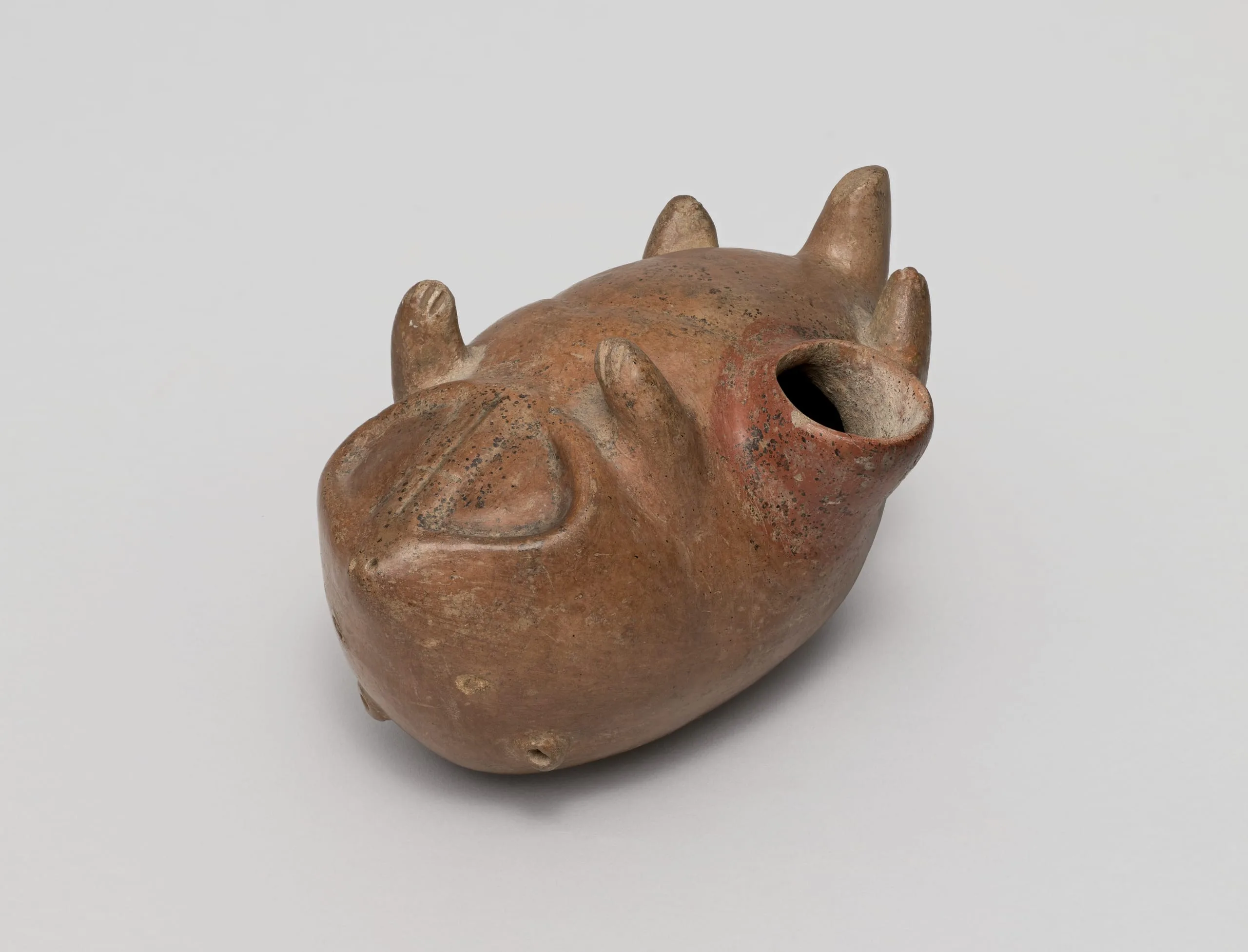 Ceramic effigy vessel with burnished red-brown slip, rounded body with four upward-curving limb-like projections and a tubular spout, small circular details on surface.