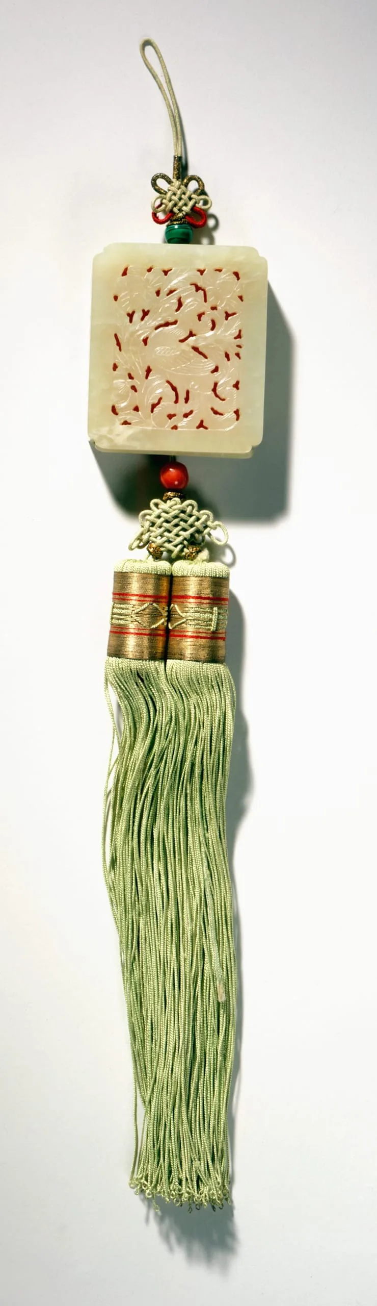 - Carved amber, coral, and jade with knotted and metal-wrapped threads and silk string