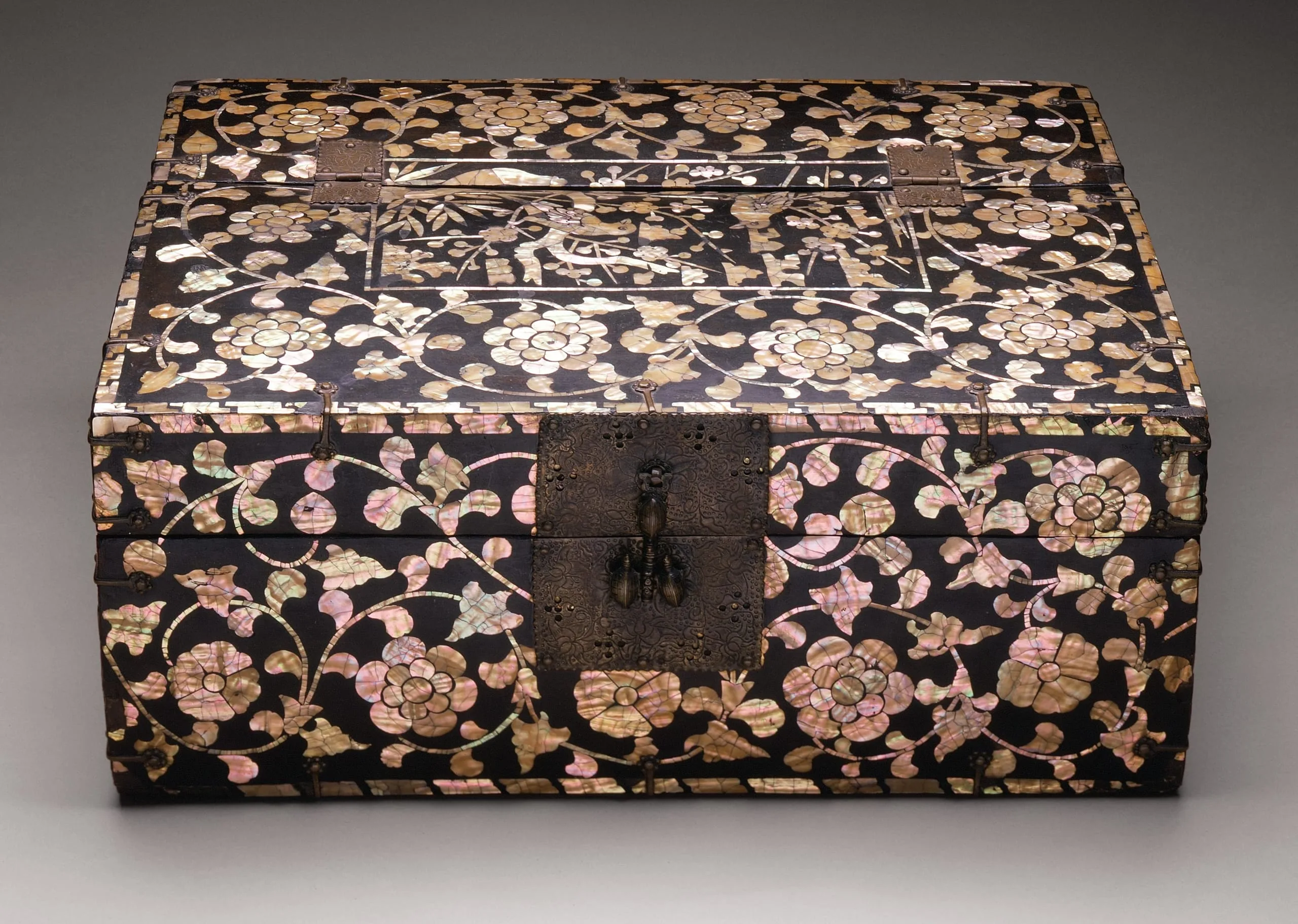 A fine example of pictorial design, this box is decorated with a rectangular cartouche that features blossoming plum branches and a pair of birds, surrounded by a continuous floral pattern. During the middle Joseon period, painterly designs such as birds and flowers, bamboo, and grapevines first began to appear on lacquer. As mother-of-pearl designs became larger in size, artists developed new techniques that were more effective. For example, an artisan, after first cutting a design, then crushed the shell before applying the pieces to the lacquer, which was a much more effective method that eventually influenced Japanese lacquer production.