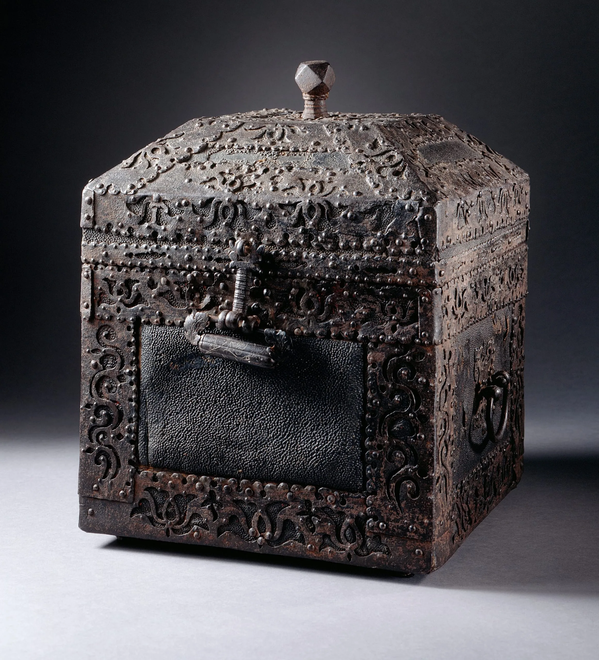 - Shark skin on wood core with hammered, cut, and cast iron fittings with silver wire inlay