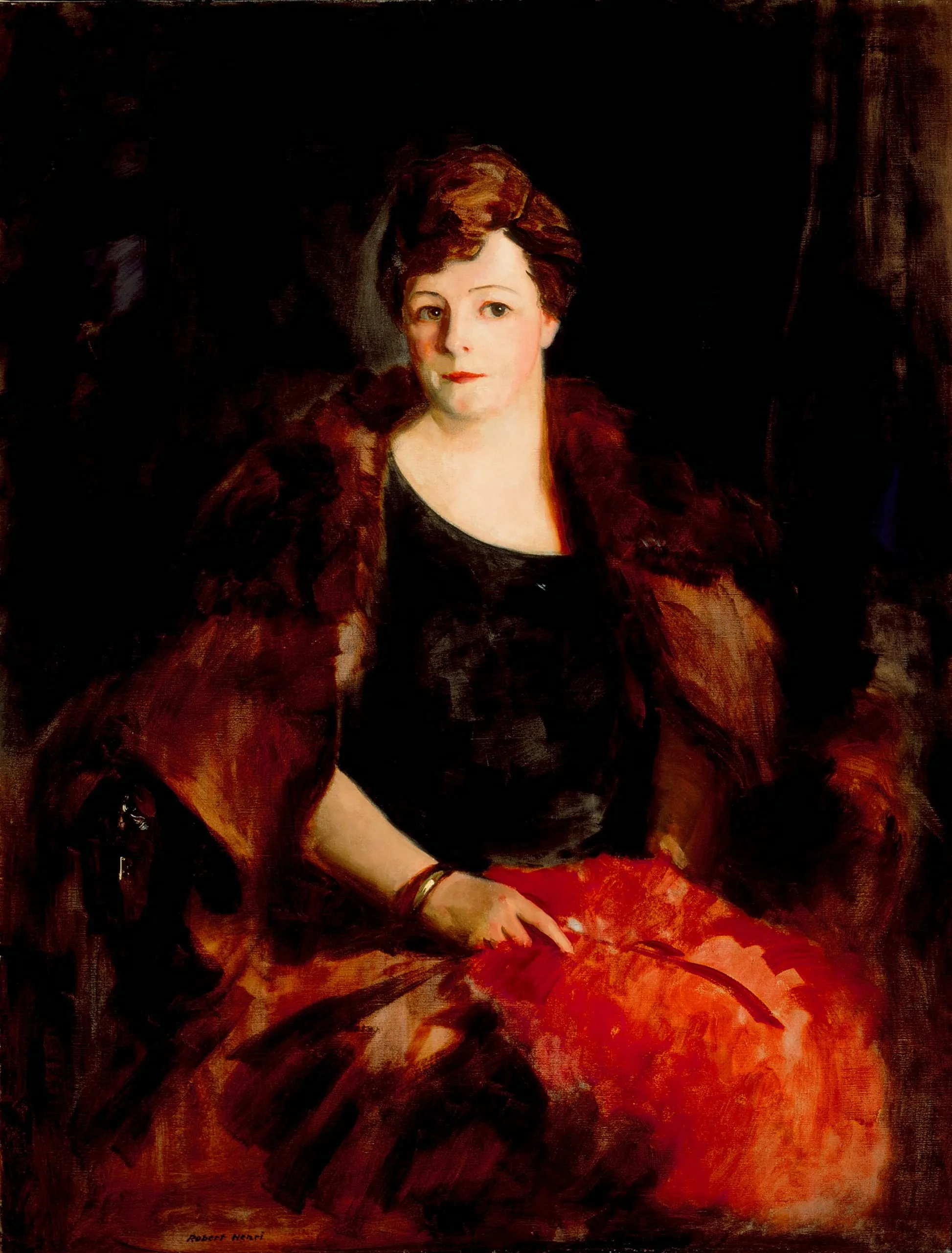 Henri’s portrayal of Ada Harrison is somewhat conservative, probably due to her social prominence and to the fact that the work was intended to hang in the museum next to Adams’s portrait of her husband. Mrs. Harrison was a large woman, and although Henri did not falsify this aspect of her appearance, he did give her an air of dignity. He minimized Mrs. Harrison’s bulk somewhat by showing her in a black dress partially covered by a furtrimmed, deep orange wrap. She holds a large, feathered fan. In his early paintings of dancers Henri often included such fans. The fan does not contradict the image of Mrs. Harrison’s respectability but does add an important color note to this basically dark painting.