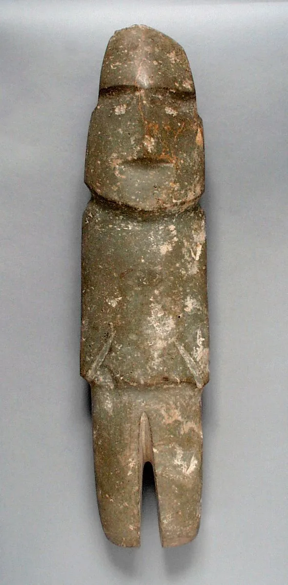 Stone figurine of a stylized standing human form with a large ovoid head, blocky rectangular torso, and short columnar legs, surface covered in sage green and rusty orange-brown patina