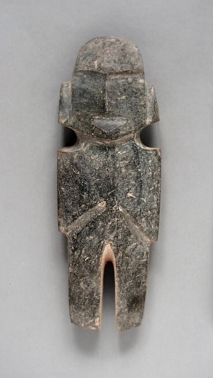 Small carved stone figurine of a highly simplified human form with schematic angular features, crossed chest lines, and split legs