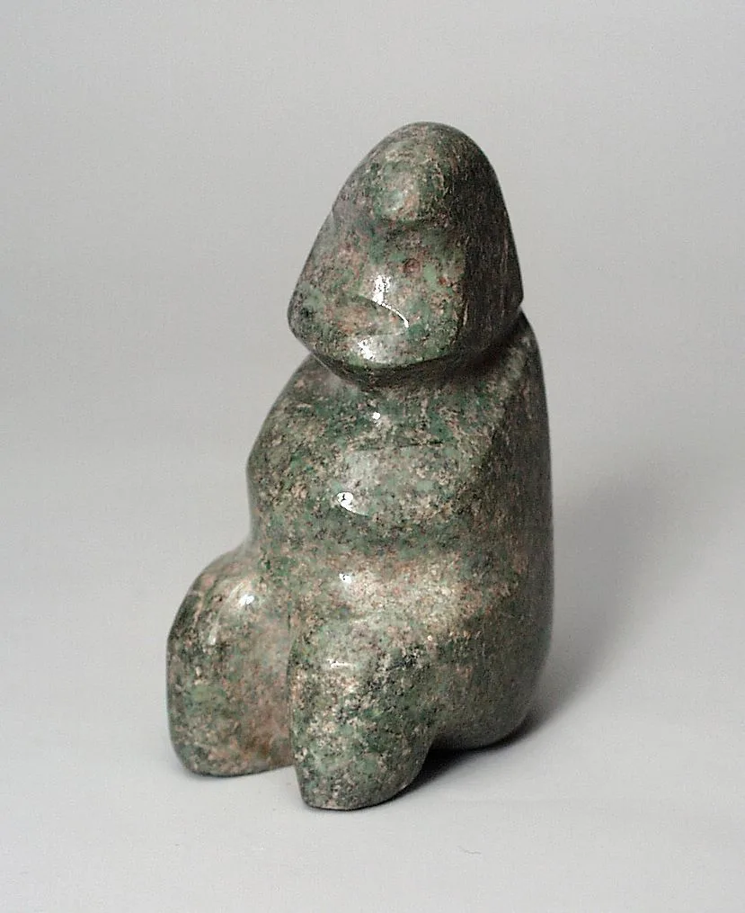 Small polished stone sculpture of a highly simplified seated human figure, mottled olive green and dusty rose, with smooth rounded forms and no carved facial detail