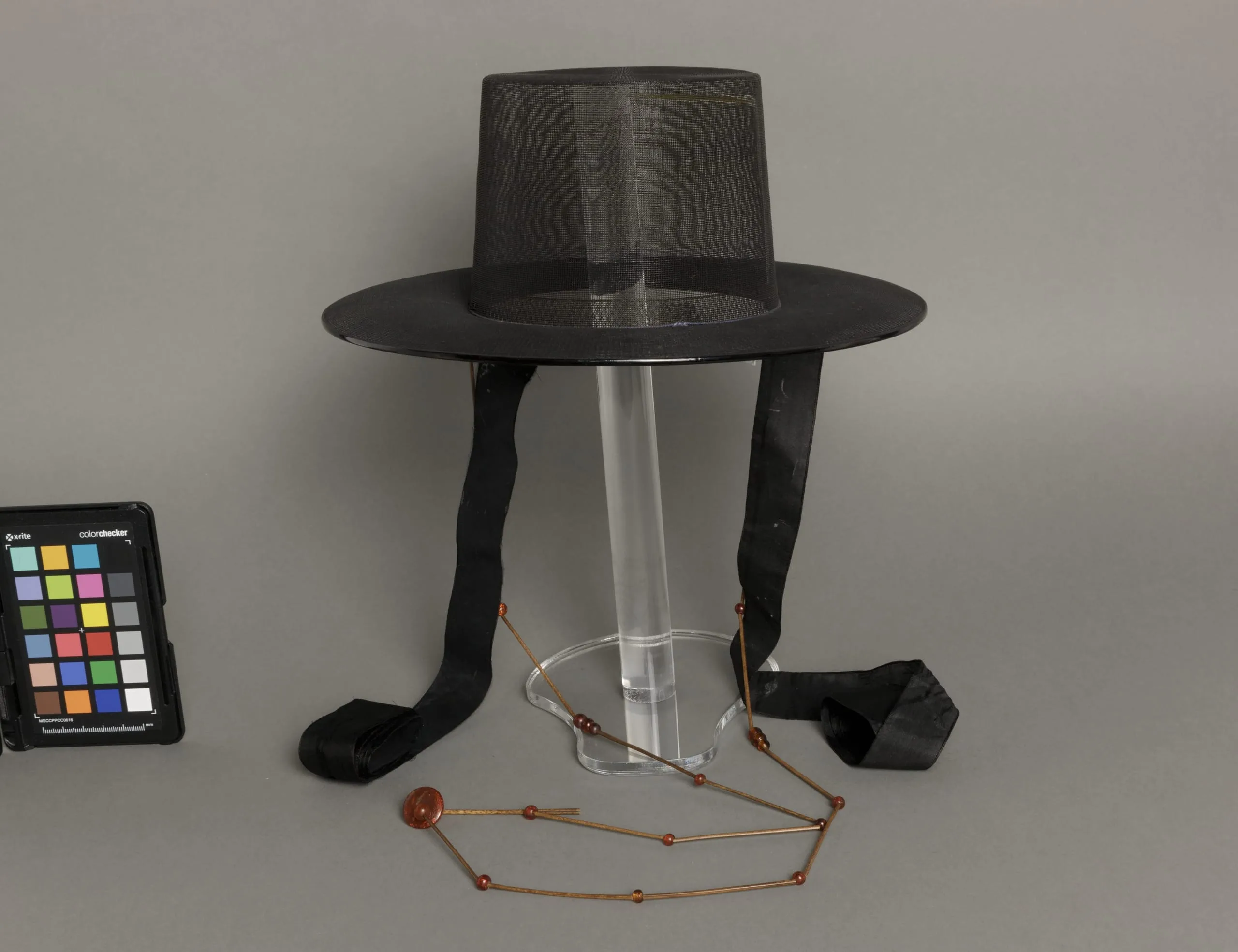 - Horse hair, twined and lacquered and bamboo lacquered and unlacquered, with silk plain weave ribbon, silk cord, and amber beads